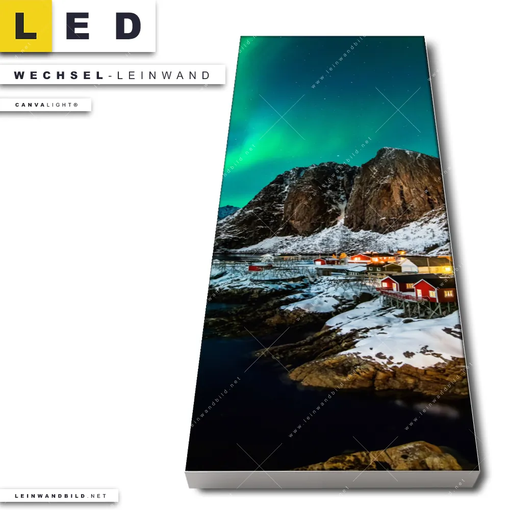 Dann sollte die Wechsel-Leinwand Canvalight® TEX | Nordlichter | Schmal den Weg zu Dir finden. Die Austausch-Leinwand Nordlichter über skandinavischem Dorf - passend für unsere stufenlos dimmbaren, steckerfertigen Leinwandbilder im LED Leuchtrahmen mit Fernbedienung und optionaler Farbtemperatursteuerung - fügt sich als Eye-Catcher harmonisch in jedes Arzt - Praxis, Büro - Kanzlei, Wohnzimmer - Schlafzimmer Raumkonzept ein.