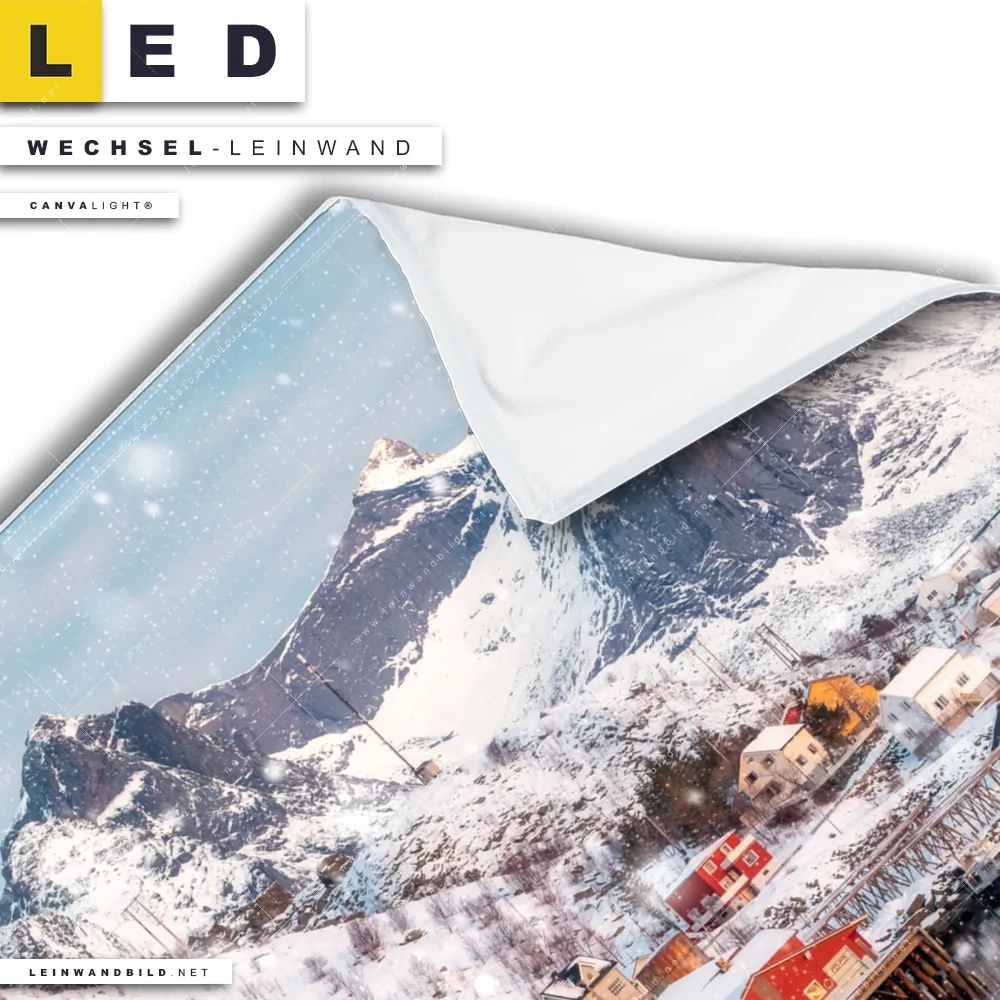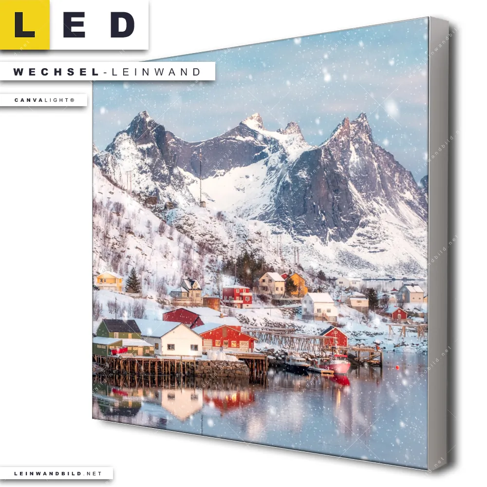 Du konfigurierst Deine individuelle LED Wechsel-Leinwand Canvalight® TEX | Skandinavisches Dorf im Schnee | Quadrat und wir produzieren sie NEU für Dich. Unsere Landschaften, Städte - Skylines Austausch-Fotoleinwände für Canvalight® LED Bilder sind KEINE Lagerware. Du bist Dir unsicher, welches Motiv oder Format das richtige für dein individuelles LED Wechselmotiv auf Leinwand ist, dann helfen wir dir gerne weiter und beraten dich!