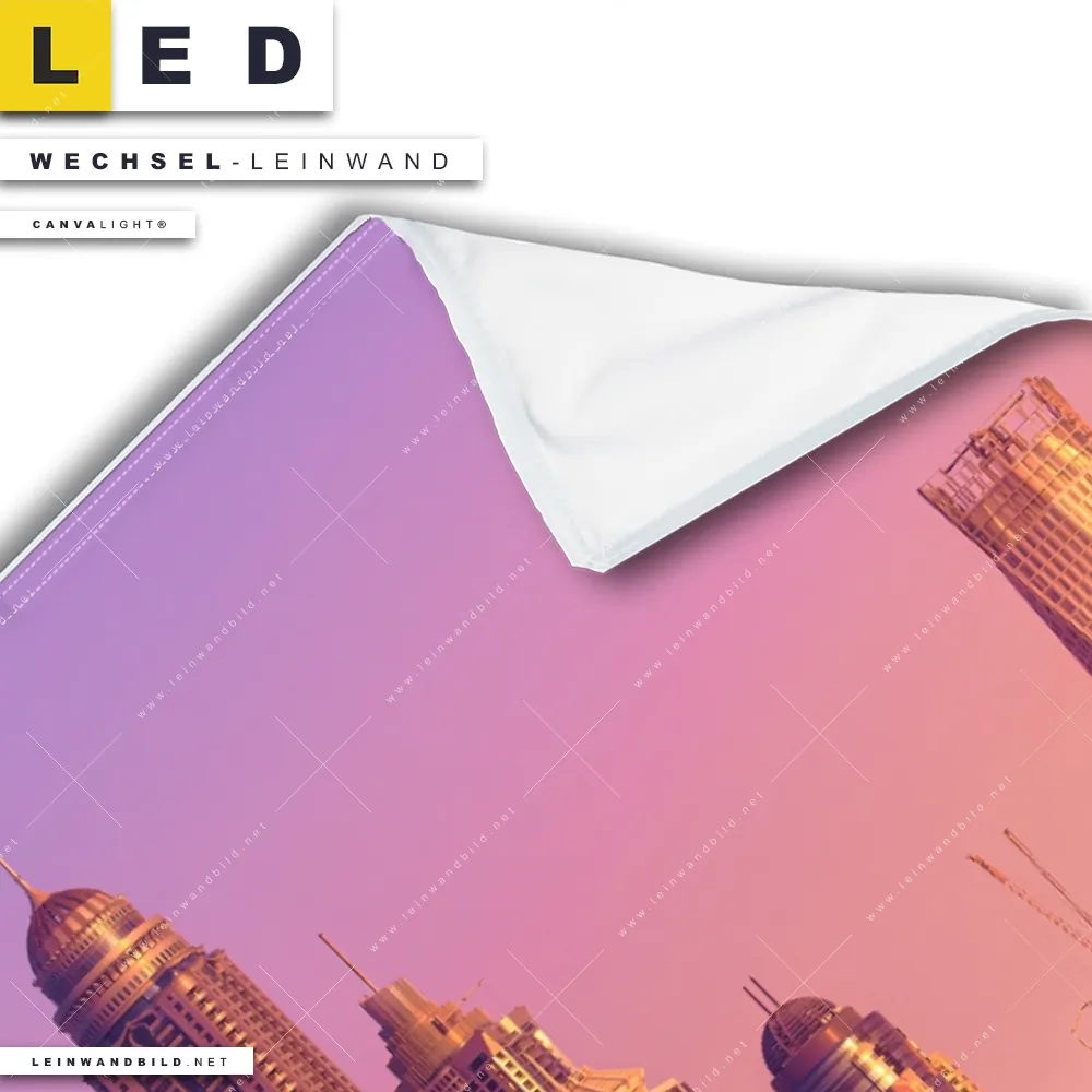 Bitte beachte, dass die Farben, der auf dem Monitor abgebildeten farbenfroher Sommermorgen mit Wolkenkratzern Darstellung, möglicherweise von den Originalfarben deiner Canvalight® TEX Wechsel-Leinwand abweichen können.