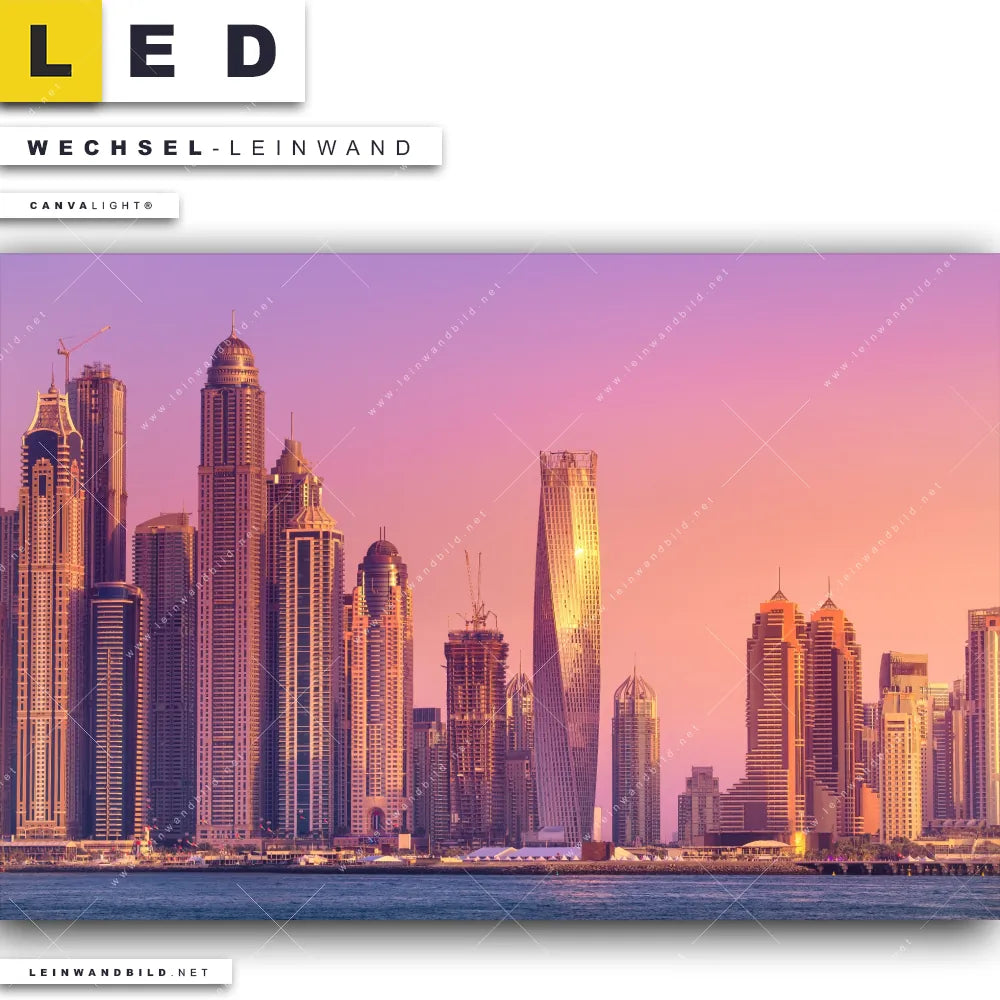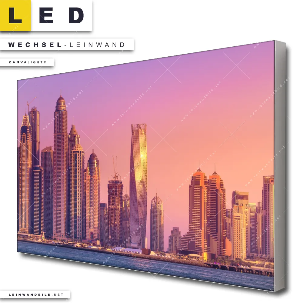 Du konfigurierst Deine individuelle LED Wechsel-Leinwand Canvalight® TEX | Sonnenaufgang in Dubai | Querformat und wir produzieren sie NEU für Dich. Unsere Architektur - Gebäude, Städte - Skylines Austausch-Fotoleinwände für Canvalight® LED Bilder sind KEINE Lagerware. Du bist Dir unsicher, welches Motiv oder Format das richtige für dein individuelles LED Wechselmotiv auf Leinwand ist, dann helfen wir dir gerne weiter und beraten dich!