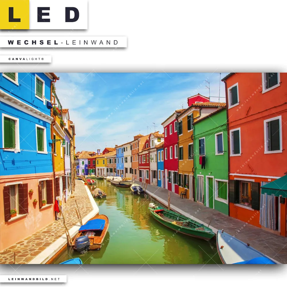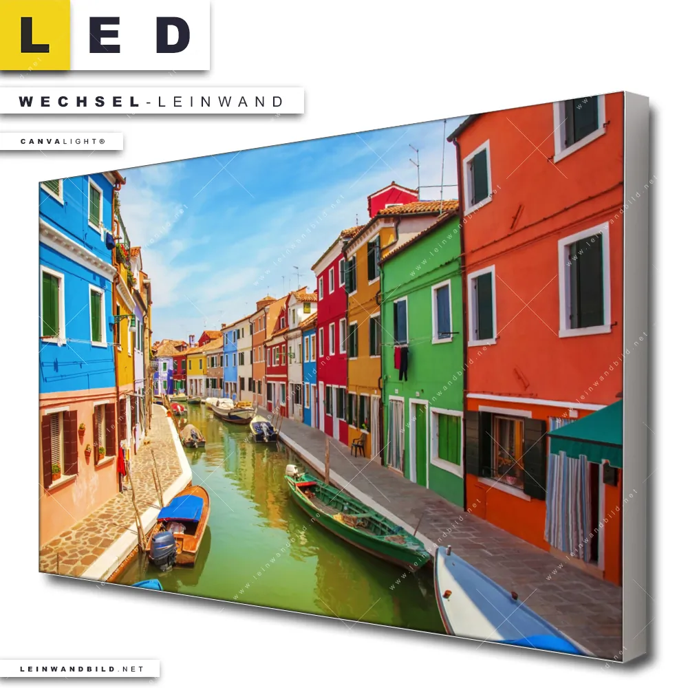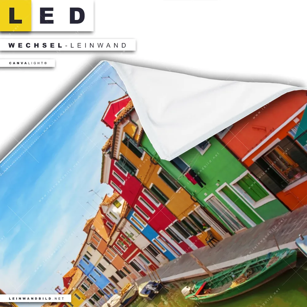 Du bist auf der Suche nach einer Architektur - Gebäude, Städte - Skylines Wechsel-Leinwand für Dein LED-Leinwandbild im Querformat? Begriffe wie Stadt, Skyline, Himmel, Hafenstadt, Fluss, Venedig, Burano, Boote, bunte Häuser haben Dich auf der Suche nach Deiner Ersatz-Leinwand für dein breites LED Wandbild mit wechselbarer Leinwand inspiriert? Farben wie Bunt dürfen auf Deinem neuen Wechselmotiv für Dein XXL Leinwand-LED-Bild nicht fehlen und Leinwände im Natürlich - Realistisch Stil für Leuchtbilder passen perfekt zu Deinem Einrichtungsstil?