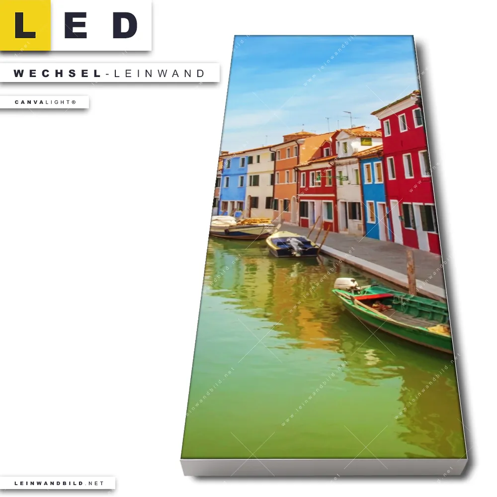 Du bist auf der Suche nach einer Architektur - Gebäude, Städte - Skylines Wechsel-Leinwand für Dein LED-Leinwandbild im Schmalen Format? Begriffe wie Stadt, Skyline, Himmel, Hafenstadt, Fluss, Venedig, Burano, Boote, bunte Häuser haben Dich auf der Suche nach Deiner Ersatz-Leinwand für dein LED Wandbild im Panorama-Hochformat mit wechselbarer Leinwand inspiriert? Farben wie Bunt dürfen auf Deinem neuen Wechselmotiv für Dein XXL Leinwand-LED-Bild nicht fehlen und Leinwände im Natürlich - Realistisch Stil für Leuchtbilder passen perfekt zu Deinem Einrichtungsstil?