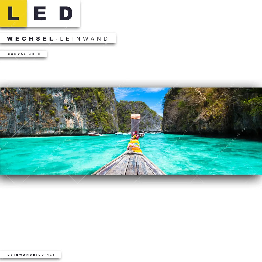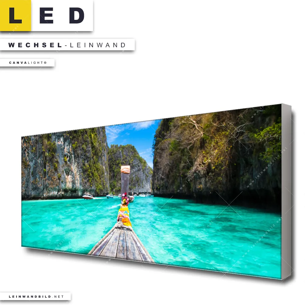 Du bist auf der Suche nach einer Landschaften, Strand - Meer Wechsel-Leinwand für Dein LED-Leinwandbild im Panorama-Format? Begriffe wie Meer, Strand, Thailand, Bucht, Asien, Sommer, Boot, Felsen, Berg, Südsee - Karibik, Urlaub - Reisen haben Dich auf der Suche nach Deiner Ersatz-Leinwand für dein extra breites LED Wandbild mit wechselbarer Leinwand inspiriert? Farben wie Blau, Türkis, Weiss, Grün dürfen auf Deinem neuen Wechselmotiv für Dein XXL Leinwand-LED-Bild nicht fehlen und Leinwände im Natürlich - Realistisch Stil für Leuchtbilder passen perfekt zu Deinem Einrichtungsstil?
