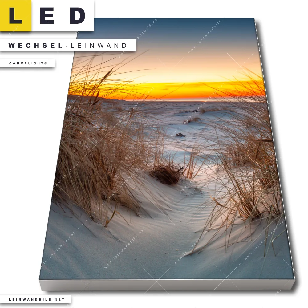 Du bist auf der Suche nach einer Landschaften, Strand - Meer Wechsel-Leinwand für Dein LED-Leinwandbild im Hochformat? Begriffe wie Deutschland, Herbst, Sommer, Urlaub - Reisen, Ostsee - Nordsee, Sonnenuntergang - Sonnenaufgang, Frühling, Sand, Dünen, Gräser haben Dich auf der Suche nach Deiner Ersatz-Leinwand für dein LED Wandbild mit wechselbarer Leinwand inspiriert? Farben wie Beige, Orange, Blau dürfen auf Deinem neuen Wechselmotiv für Dein XXL Leinwand-LED-Bild nicht fehlen und Leinwände im Natürlich - Realistisch Stil für Leuchtbilder passen perfekt zu Deinem Einrichtungsstil?