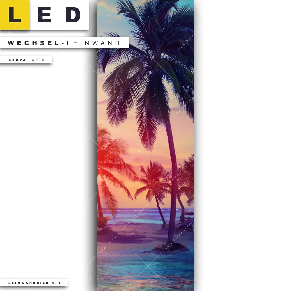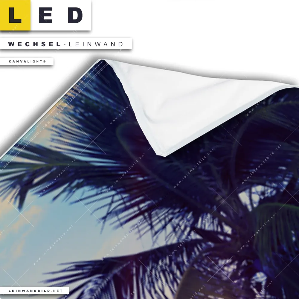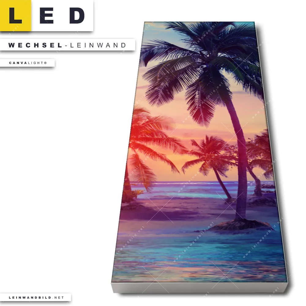 Du konfigurierst Deine individuelle LED Wechsel-Leinwand Canvalight® TEX | Palmen bei Sonnenuntergang | Schmal und wir produzieren sie NEU für Dich. Unsere Landschaften, Strand - Meer Austausch-Fotoleinwände für Canvalight® LED Bilder sind KEINE Lagerware. Du bist Dir unsicher, welches Motiv oder Format das richtige für dein individuelles LED Wechselmotiv auf Leinwand ist, dann helfen wir dir gerne weiter und beraten dich!