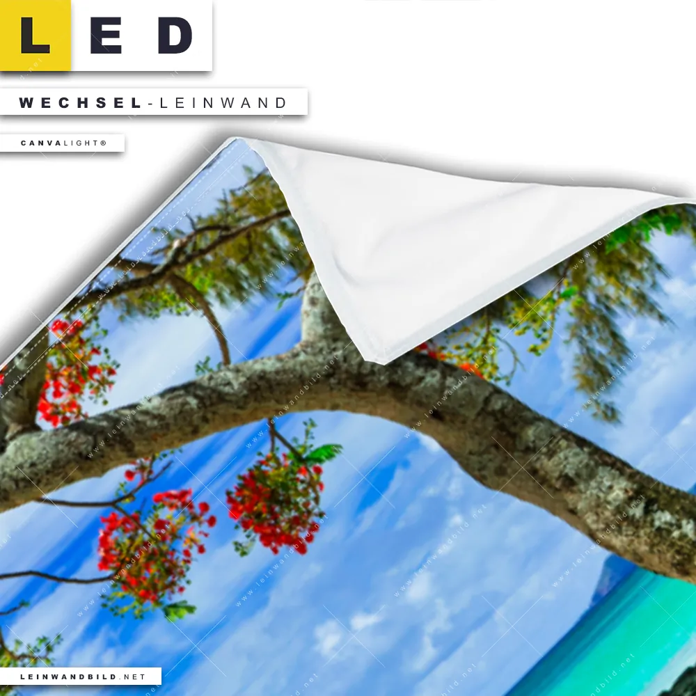 LED Wechsel-Leinwand Canvalight® TEX | Rote Blüten und Türkisfarbenes Meer | Panorama