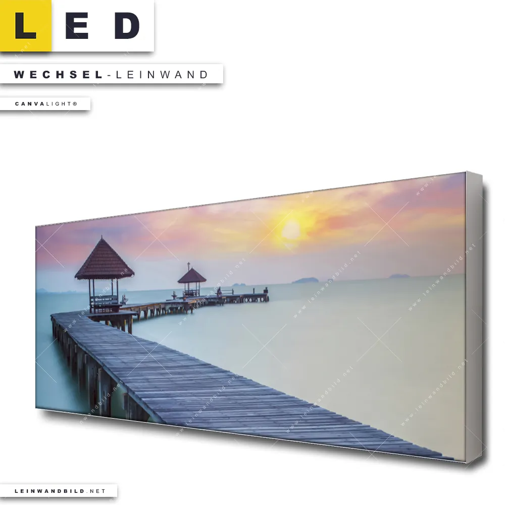 Du konfigurierst Deine individuelle LED Wechsel-Leinwand Canvalight® TEX | Steg ins Meer | Panorama und wir produzieren sie NEU für Dich. Unsere Strand - Meer, Landschaften Austausch-Fotoleinwände für Canvalight® LED Bilder sind KEINE Lagerware. Du bist Dir unsicher, welches Motiv oder Format das richtige für dein individuelles LED Wechselmotiv auf Leinwand ist, dann helfen wir dir gerne weiter und beraten dich!