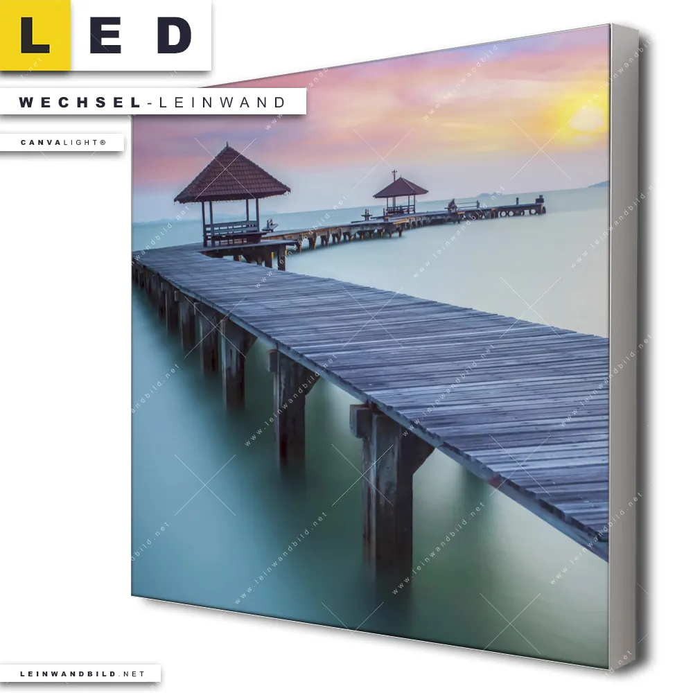 Du konfigurierst Deine individuelle LED Wechsel-Leinwand Canvalight® TEX | Steg ins Meer | Quadrat und wir produzieren sie NEU für Dich. Unsere Strand - Meer, Landschaften Austausch-Fotoleinwände für Canvalight® LED Bilder sind KEINE Lagerware. Du bist Dir unsicher, welches Motiv oder Format das richtige für dein individuelles LED Wechselmotiv auf Leinwand ist, dann helfen wir dir gerne weiter und beraten dich!