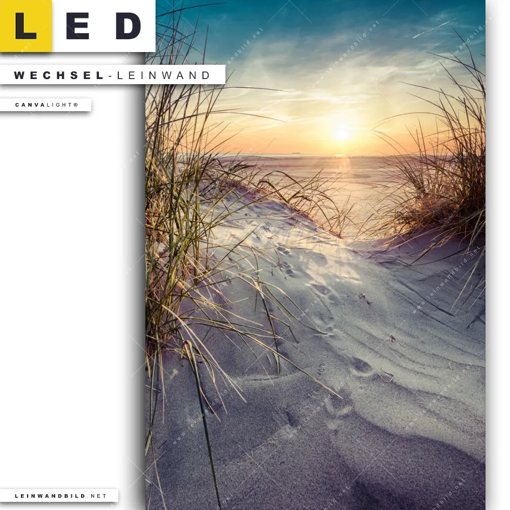 Auf der Suche nach Deinem neuen Wechselmotiv für LED Bilder mit austauschbarer Textil-Leinwand haben Dich Begriffe wie Meer, Sonnenuntergang, Strand, Nordsee, Ostsee, Düne, Gras, Deutschland, Reise, Herbst, Sommer inspiriert? Dann sollte die Wechsel-Leinwand Dünengräser bei Sonnenuntergang für Canvalight® TEX LED Leuchtbilder den Weg zu Dir finden.