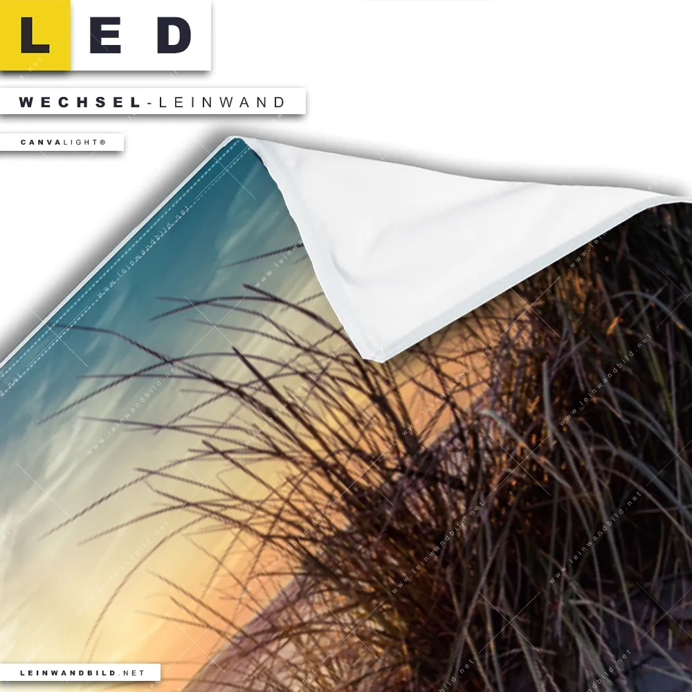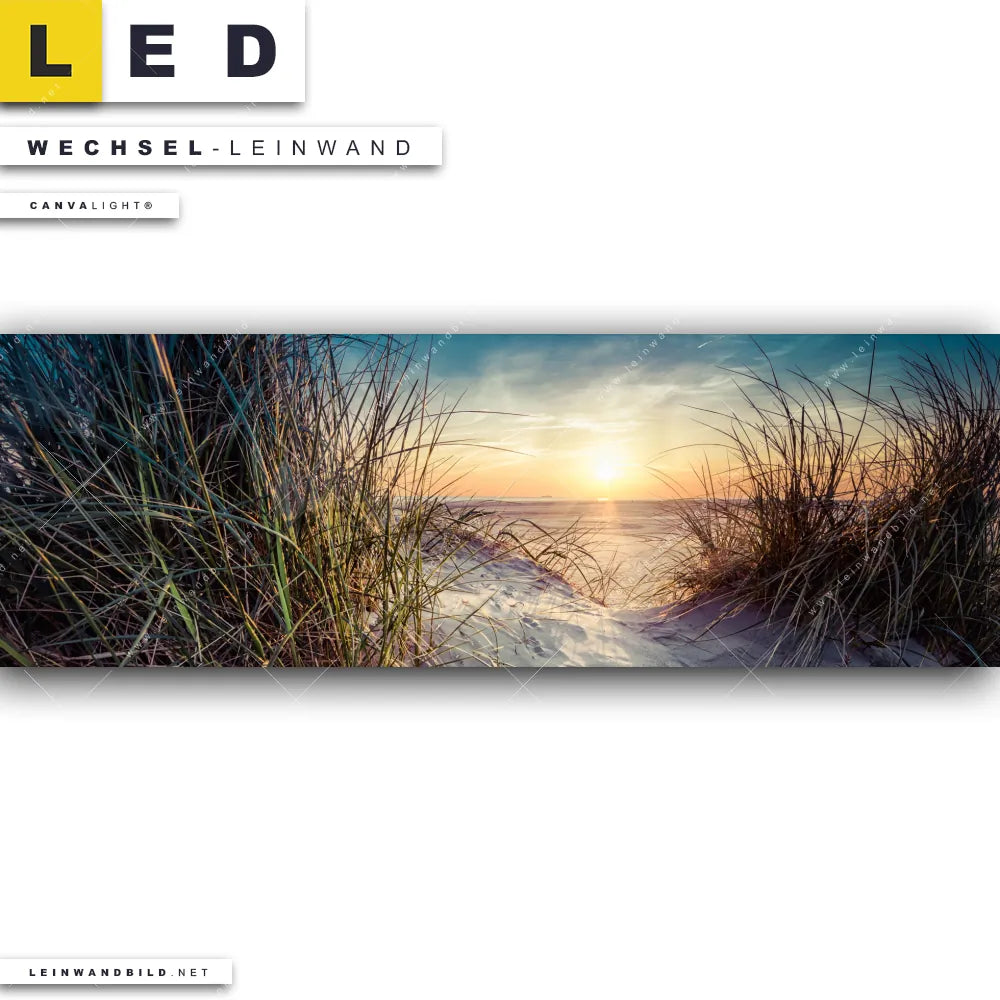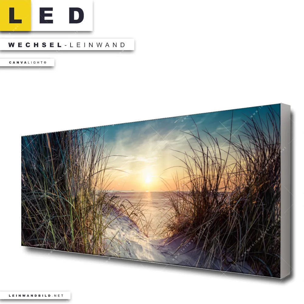 Du bist auf der Suche nach einer Landschaften, Strand - Meer Wechsel-Leinwand für Dein LED-Leinwandbild im Panorama-Format? Begriffe wie Meer, Sonnenuntergang, Strand, Nordsee, Ostsee, Düne, Gras, Deutschland, Reise, Herbst, Sommer haben Dich auf der Suche nach Deiner Ersatz-Leinwand für dein extra breites LED Wandbild mit wechselbarer Leinwand inspiriert? Farben wie Beige, Blau, Grün, Hellgrün dürfen auf Deinem neuen Wechselmotiv für Dein XXL Leinwand-LED-Bild nicht fehlen und Leinwände im Retro - Vintage Stil für Leuchtbilder passen perfekt zu Deinem Einrichtungsstil?