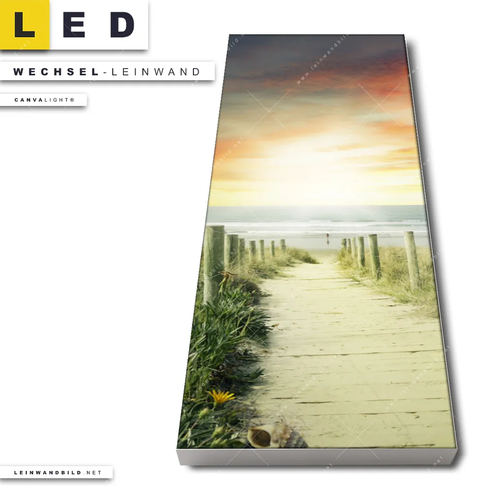 Du konfigurierst Deine individuelle LED Wechsel-Leinwand Canvalight® TEX | Weg zum Strand | Schmal und wir produzieren sie NEU für Dich. Unsere Landschaften, Strand - Meer Austausch-Fotoleinwände für Canvalight® LED Bilder sind KEINE Lagerware. Du bist Dir unsicher, welches Motiv oder Format das richtige für dein individuelles LED Wechselmotiv auf Leinwand ist, dann helfen wir dir gerne weiter und beraten dich!