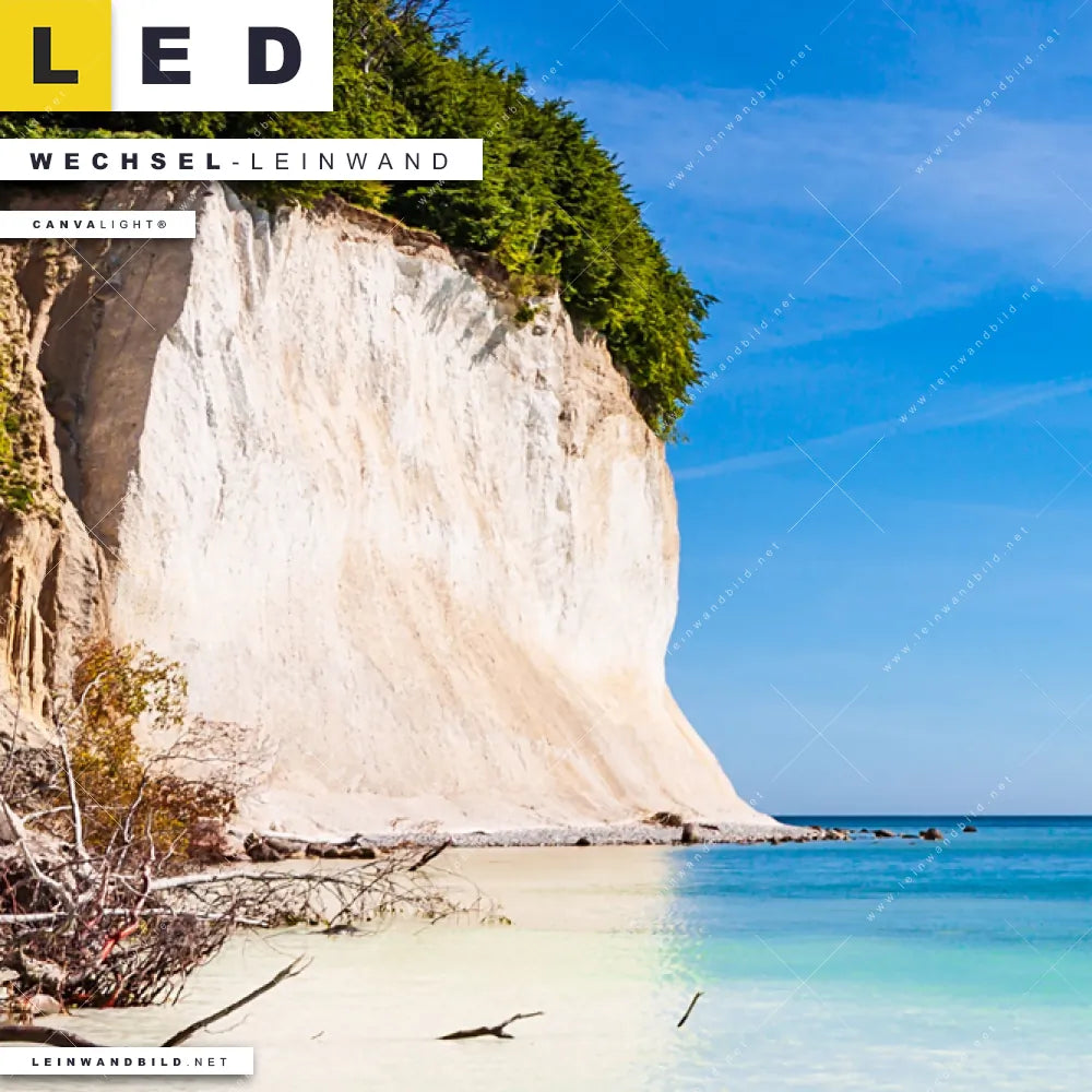 Dann sollte die Wechsel-Leinwand Canvalight® TEX | Weiße Kreidefelswand am Meer | Querformat den Weg zu Dir finden. Die Austausch-Leinwand Steilküste in Rügen - passend für unsere stufenlos dimmbaren, steckerfertigen Leinwandbilder im Leuchtrahmen mit Fernbedienung und optionaler Farbtemperatursteuerung - fügt sich als Eye-Catcher harmonisch in jedes Arzt - Praxis, Badezimmer, Büro - Kanzlei, Wohnzimmer - Schlafzimmer Raumkonzept ein.