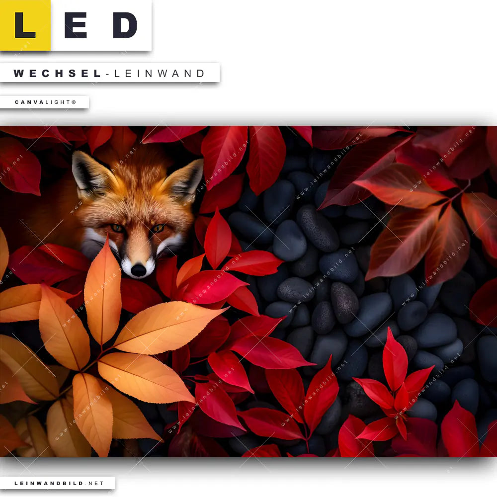 Du bist auf der Suche nach einer Tierwelt, Blumen - Botanik Wechsel-Leinwand für Dein LED-Leinwandbild im Querformat? Begriffe wie Fuchs, Natur, Rotfuchs, Tier, Tierporträt, Nahaufnahme, Blätter, Laub, Herbst haben Dich auf der Suche nach Deiner Ersatz-Leinwand für dein breites LED Wandbild mit wechselbarer Leinwand inspiriert? Farben wie Orange, Rot, Schwarz dürfen auf Deinem neuen Wechselmotiv für Dein XXL Leinwand-LED-Bild nicht fehlen und Leinwände im Natürlich - Realistisch, Floral Stil für Leuchtbilder passen perfekt zu Deinem Einrichtungsstil?