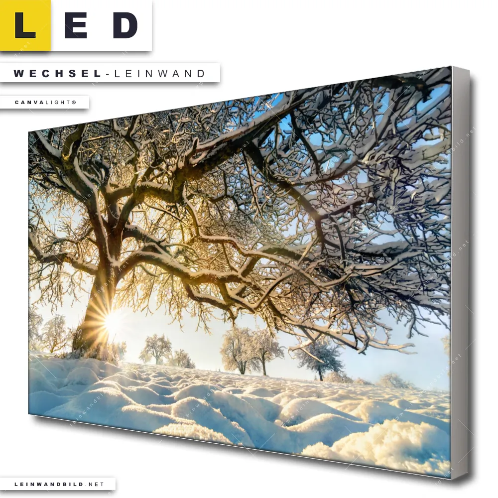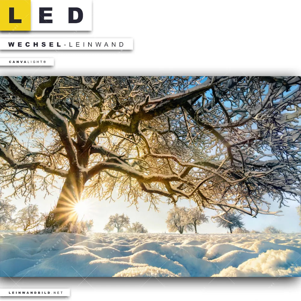 Du bist auf der Suche nach einer Landschaften, Winter, Wald - Bäume Wechsel-Leinwand für Dein LED-Leinwandbild im Querformat? Begriffe wie Baum, Schneelandschaft, Winter, Schnee, Sonnenaufgang, Sonnenlicht, Bäume haben Dich auf der Suche nach Deiner Ersatz-Leinwand für dein breites LED Wandbild mit wechselbarer Leinwand inspiriert? Farben wie Weiss, Braun, Blau dürfen auf Deinem neuen Wechselmotiv für Dein XXL Leinwand-LED-Bild nicht fehlen und Leinwände im Natürlich - Realistisch Stil für Leuchtbilder passen perfekt zu Deinem Einrichtungsstil?