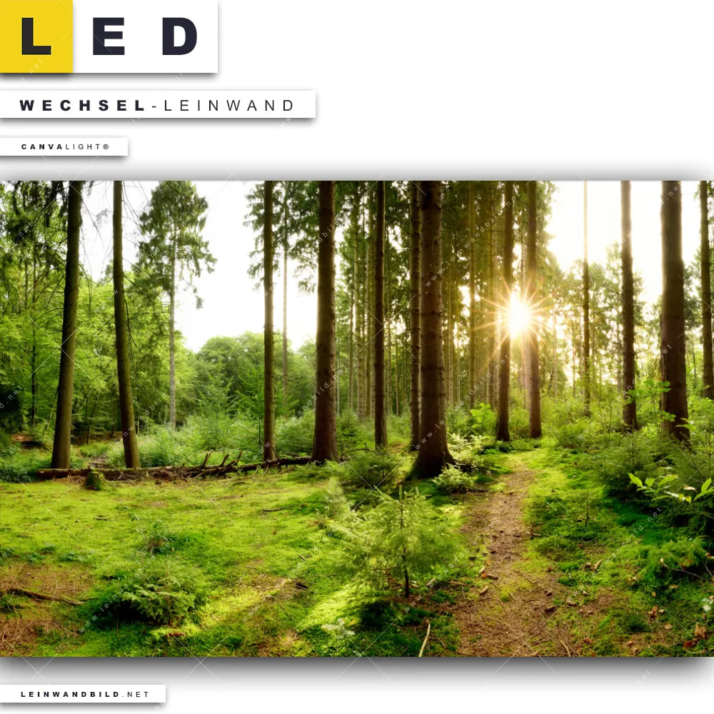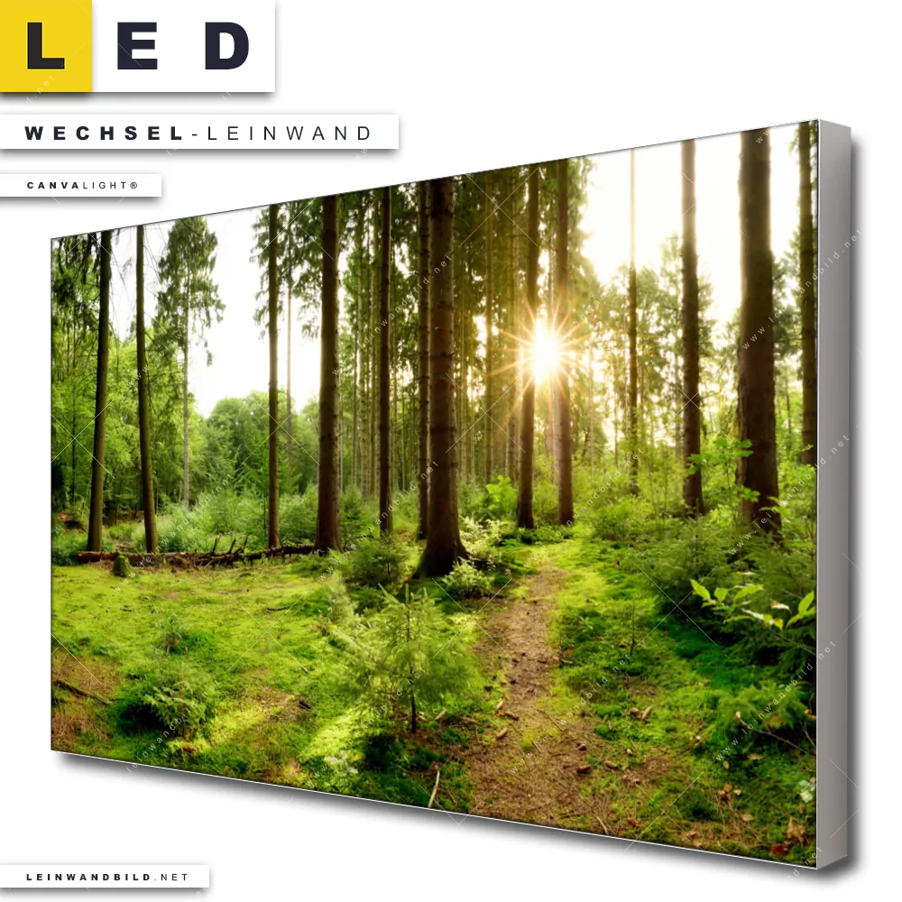 LED Wechsel-Leinwand Canvalight® TEX | Wald mit Sonnenstrahlen No.2 | Querformat