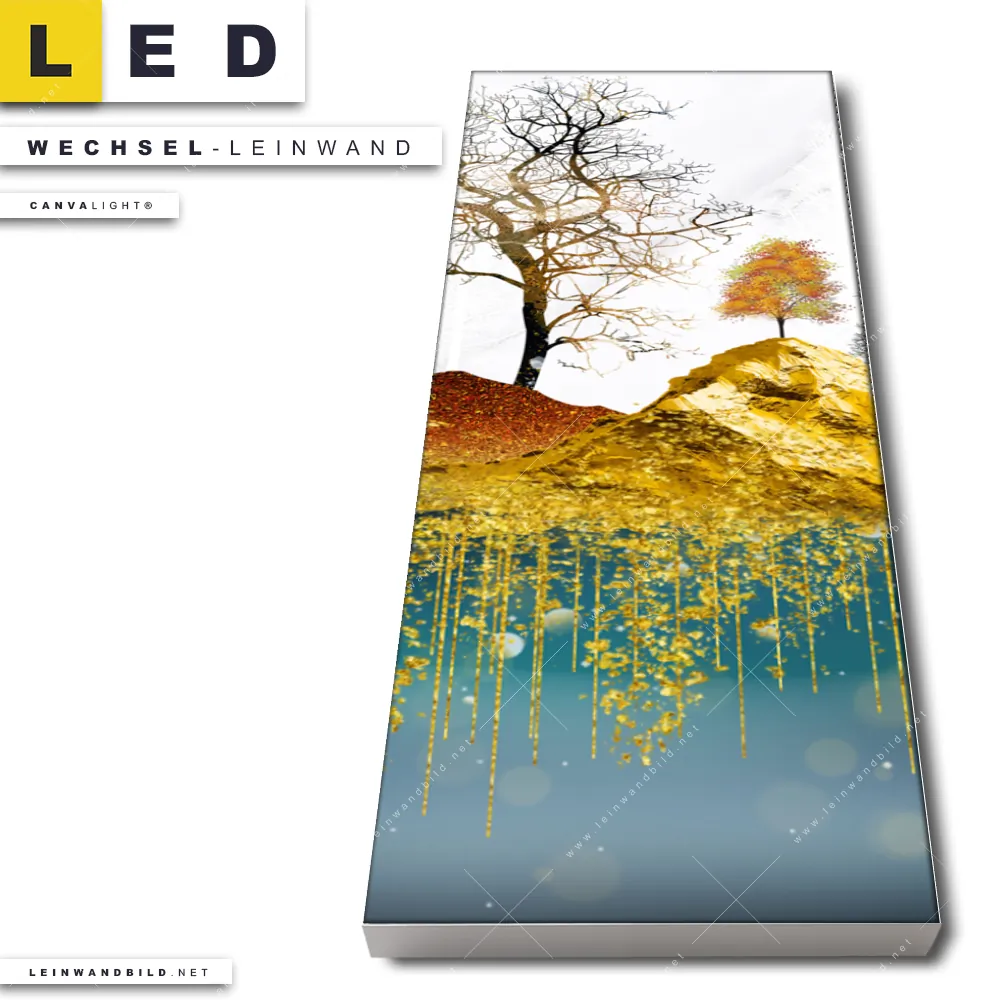 Dann sollte die Wechsel-Leinwand Canvalight® TEX | Abstrakte Landschaft No.1 | Schmal den Weg zu Dir finden. Die Austausch-Leinwand goldener Farblauf vom Wald - passend für unsere stufenlos dimmbaren, steckerfertigen Leinwandbilder im LED Leuchtrahmen mit Fernbedienung und optionaler Farbtemperatursteuerung - fügt sich als Eye-Catcher harmonisch in jedes Wohnzimmer - Schlafzimmer, Bar - Gastronomie, Arzt - Praxis, Büro - Kanzlei Raumkonzept ein.
