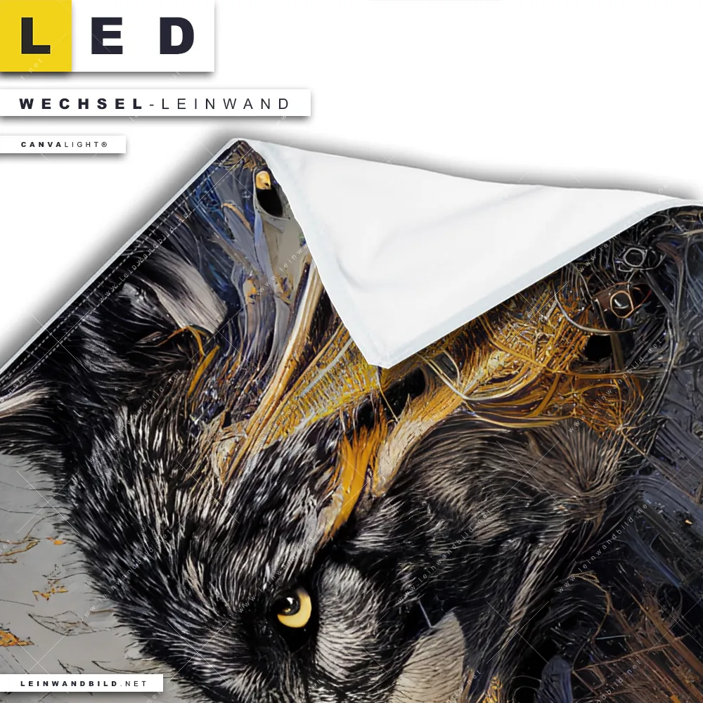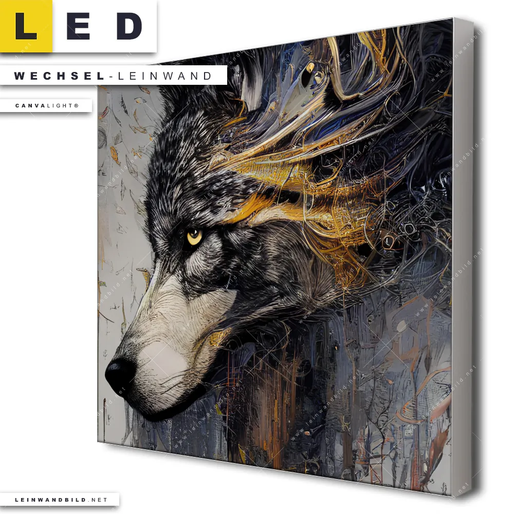 LED Wechsel-Leinwand Canvalight® TEX | Abstrakter Wolf in Gold und Grau | Quadrat