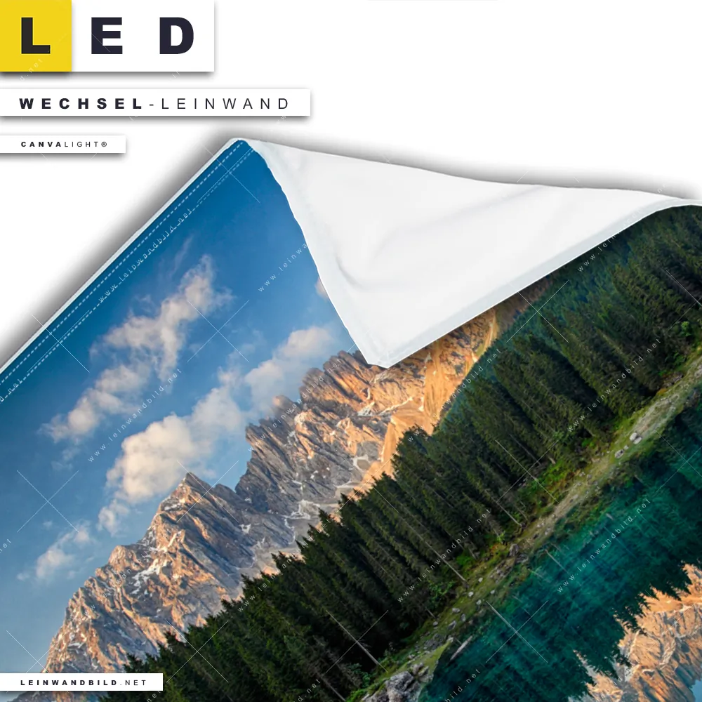 Bitte beachte, dass die Farben, der auf dem Monitor abgebildeten Bergwald am See Darstellung, möglicherweise von den Originalfarben deiner Canvalight® TEX Wechsel-Leinwand abweichen können.