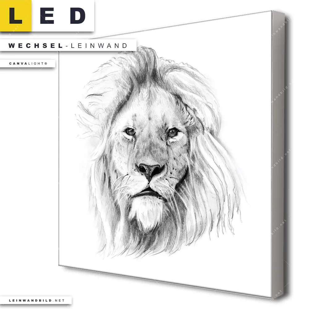Du konfigurierst Deine individuelle LED Wechsel-Leinwand Canvalight® TEX | Bleistiftzeichnung Löwe | Quadrat und wir produzieren sie NEU für Dich. Unsere Tierwelt Austausch-Fotoleinwände für Canvalight® LED Bilder sind KEINE Lagerware. Du bist Dir unsicher, welches Motiv oder Format das richtige für dein individuelles LED Wechselmotiv auf Leinwand ist, dann helfen wir dir gerne weiter und beraten dich!