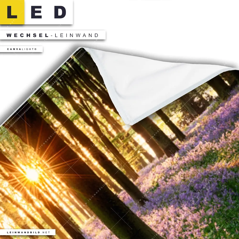 Du konfigurierst Deine individuelle LED Wechsel-Leinwand Canvalight® TEX | Blühender Wald bei Sonnenaufgang | Panorama und wir produzieren sie NEU für Dich. Unsere Blumen - Botanik, Landschaften, Wald - Bäume Austausch-Fotoleinwände für Canvalight® LED Bilder sind KEINE Lagerware. Du bist Dir unsicher, welches Motiv oder Format das richtige für dein individuelles LED Wechselmotiv auf Leinwand ist, dann helfen wir dir gerne weiter und beraten dich!