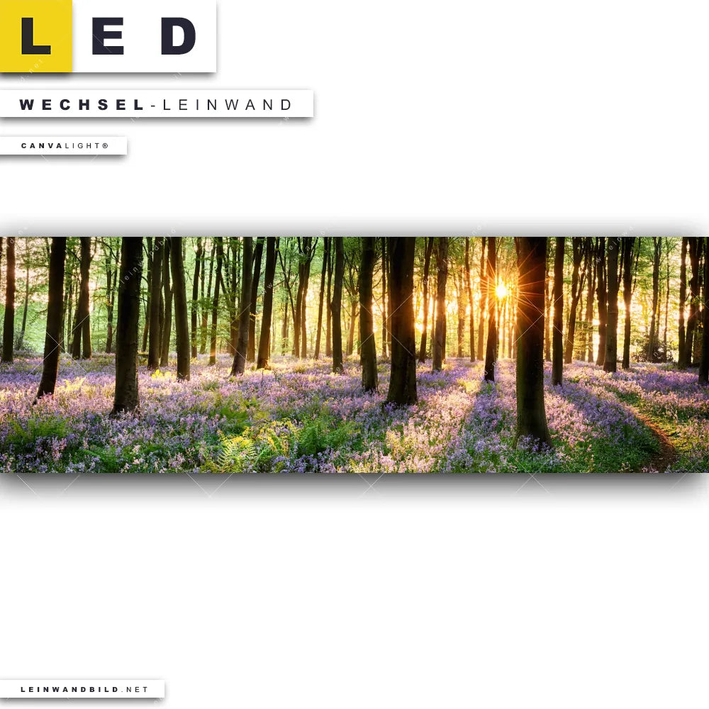 LED Wechsel-Leinwand Canvalight® TEX | Blühender Wald bei Sonnenaufgang | Panorama