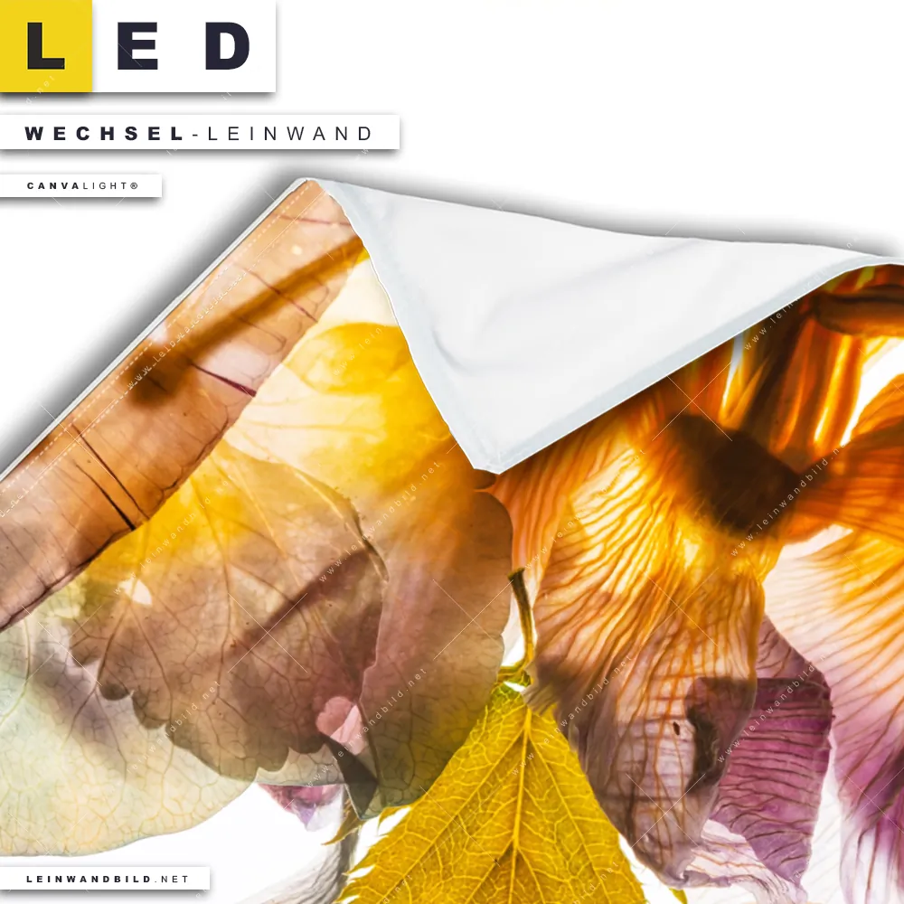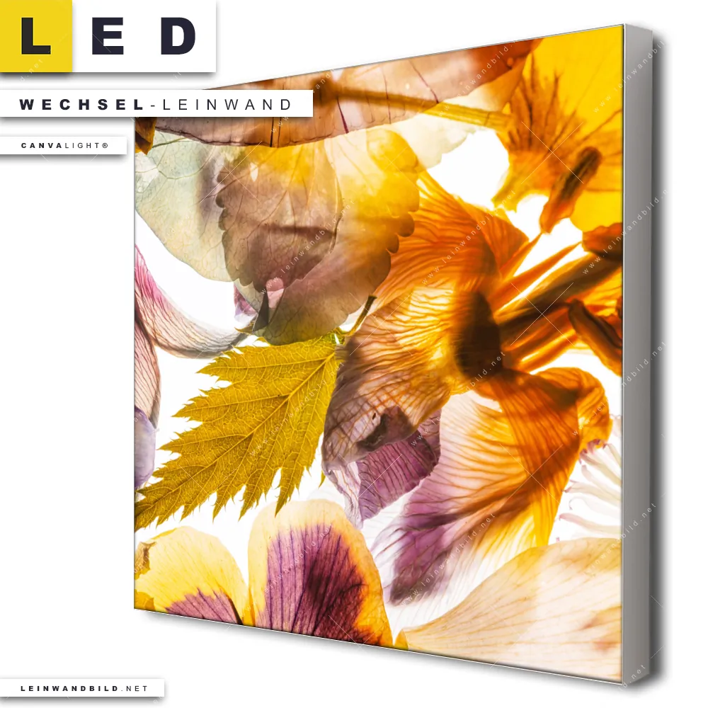 Du konfigurierst Deine individuelle LED Wechsel-Leinwand Canvalight® TEX | Blumen Collage No.1 | Quadrat und wir produzieren sie NEU für Dich. Unsere Blumen - Botanik Austausch-Fotoleinwände für Canvalight® LED Bilder sind KEINE Lagerware. Du bist Dir unsicher, welches Motiv oder Format das richtige für dein individuelles LED Wechselmotiv auf Leinwand ist, dann helfen wir dir gerne weiter und beraten dich!