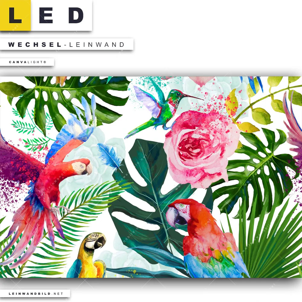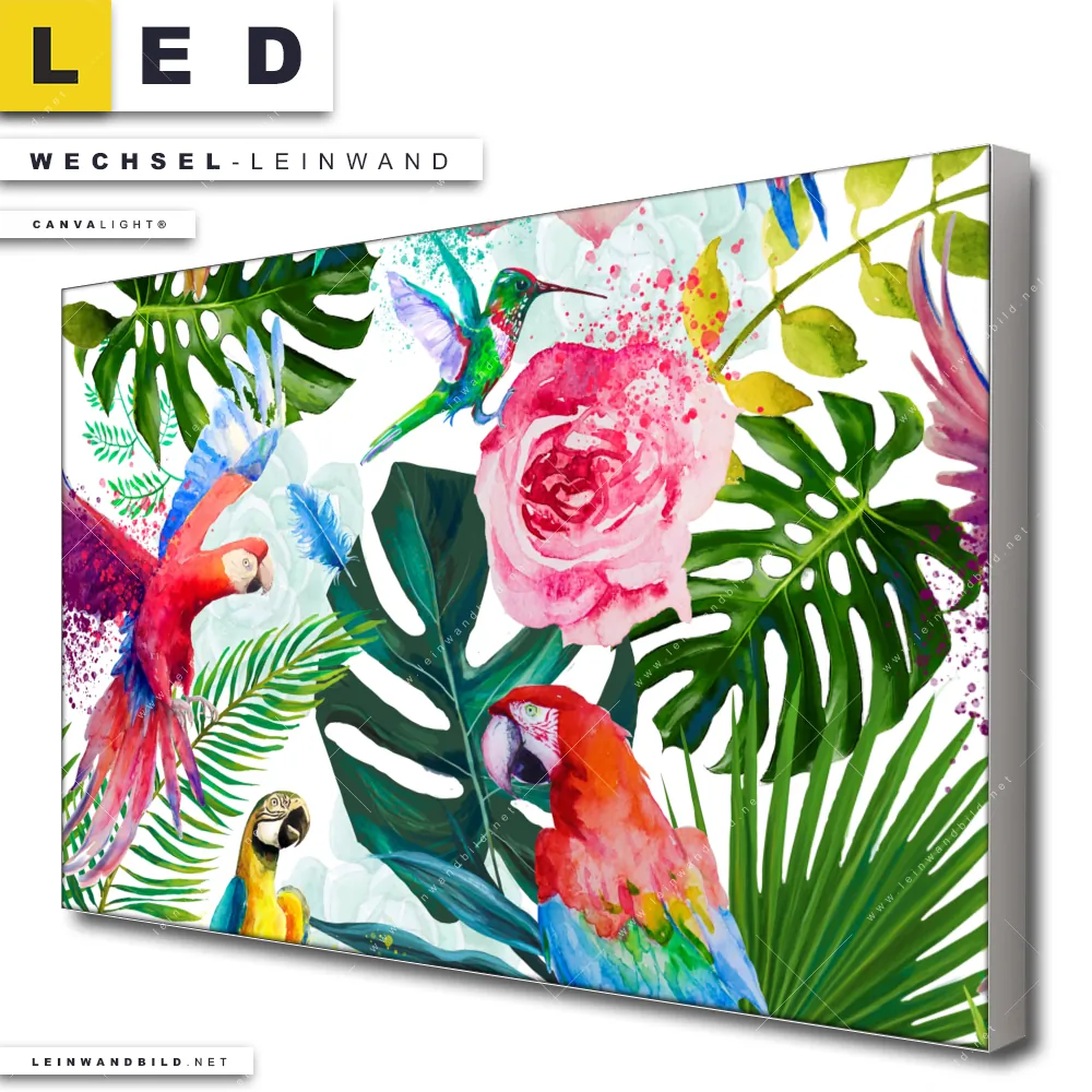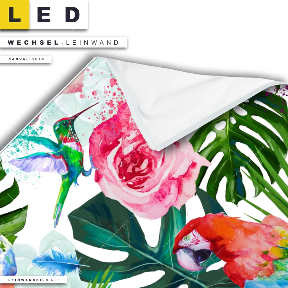 LED Wechsel-Leinwand Canvalight® TEX | Blumen & Papageien Aquarell | Querformat