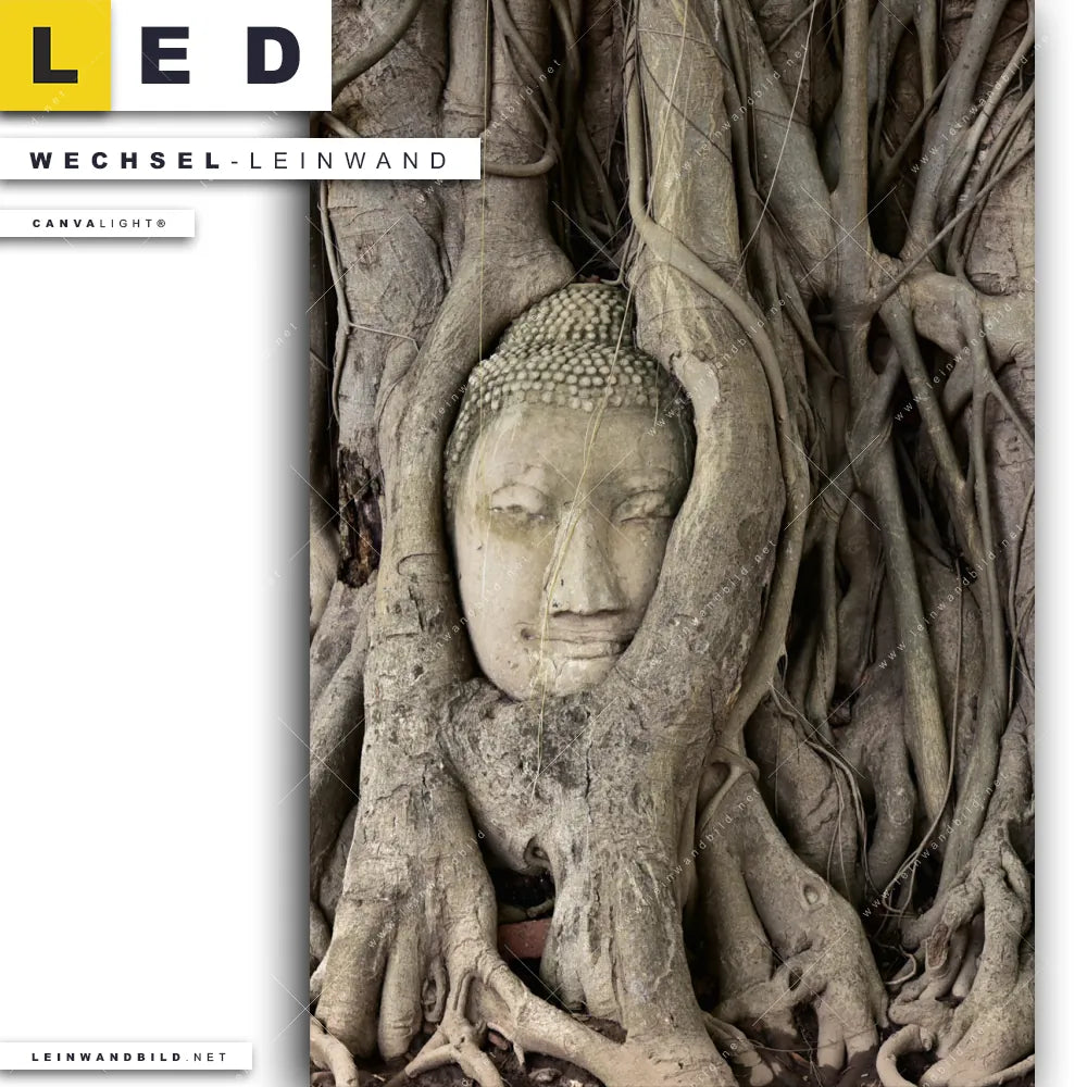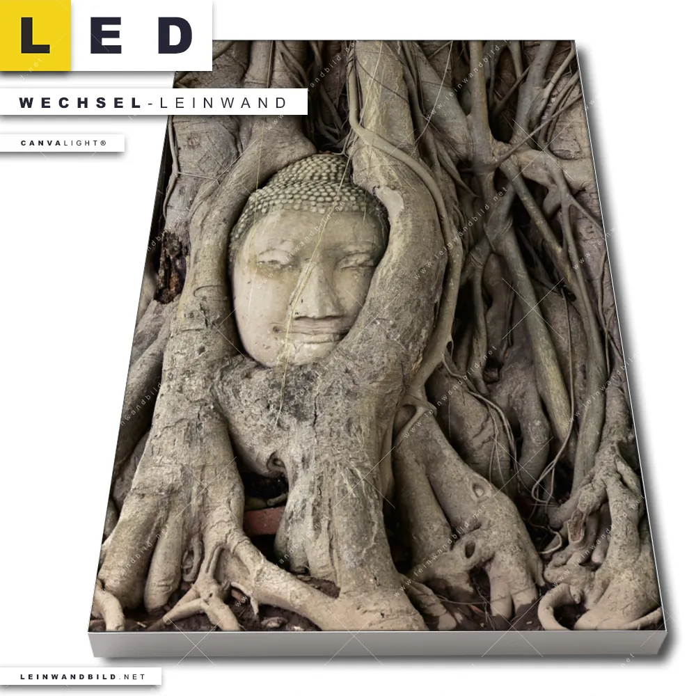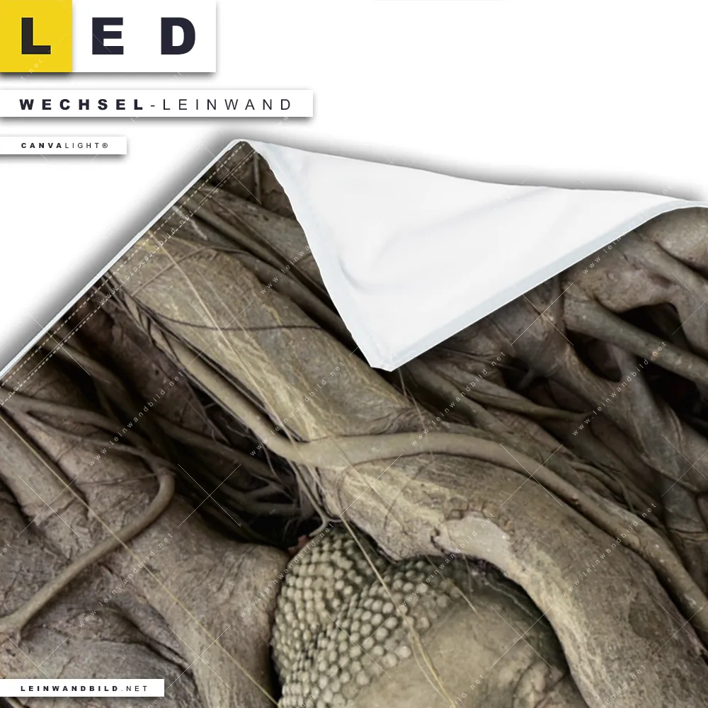LED Wechsel-Leinwand Canvalight® TEX | Buddha in Baumwurzeln | Hochformat