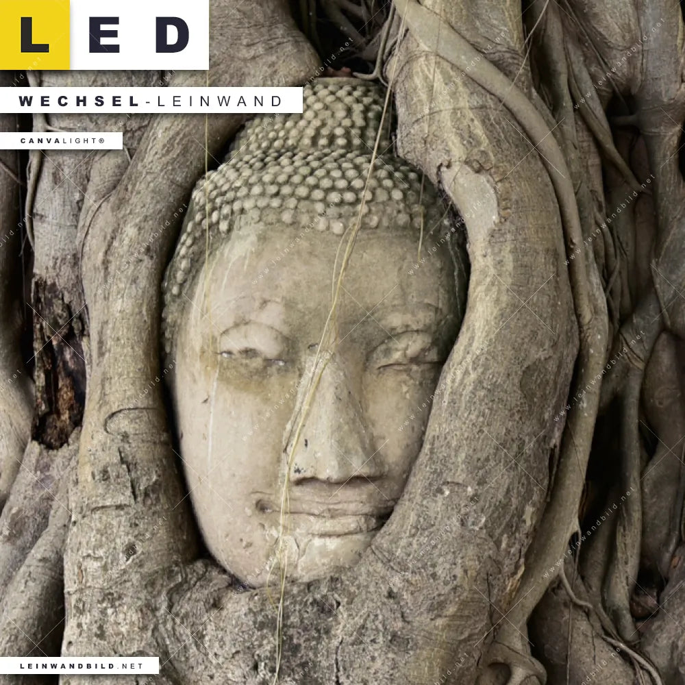 Du konfigurierst Deine individuelle LED Wechsel-Leinwand Canvalight® TEX | Buddha in Baumwurzeln | Hochformat und wir produzieren sie NEU für Dich. Unsere Buddha - Feng Shui Austausch-Fotoleinwände für Canvalight® LED Bilder sind KEINE Lagerware. Du bist Dir unsicher, welches Motiv oder Format das richtige für dein individuelles LED Wechselmotiv auf Leinwand ist, dann helfen wir dir gerne weiter und beraten dich!