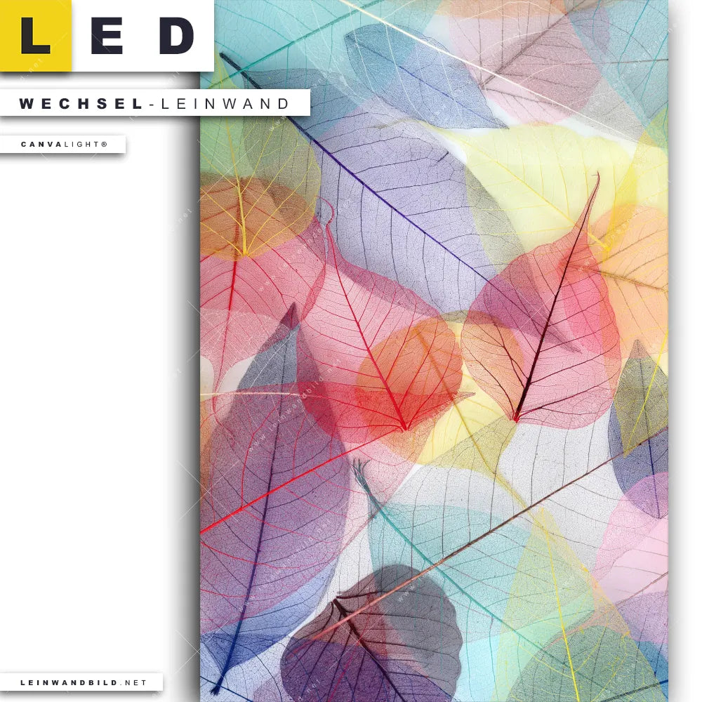 Du konfigurierst Deine individuelle LED Wechsel-Leinwand Canvalight® TEX | Bunte Blätter | Hochformat und wir produzieren sie NEU für Dich. Unsere Muster - Texturen, Blumen - Botanik Austausch-Fotoleinwände für Canvalight® LED Bilder sind KEINE Lagerware. Du bist Dir unsicher, welches Motiv oder Format das richtige für dein individuelles LED Wechselmotiv auf Leinwand ist, dann helfen wir dir gerne weiter und beraten dich!