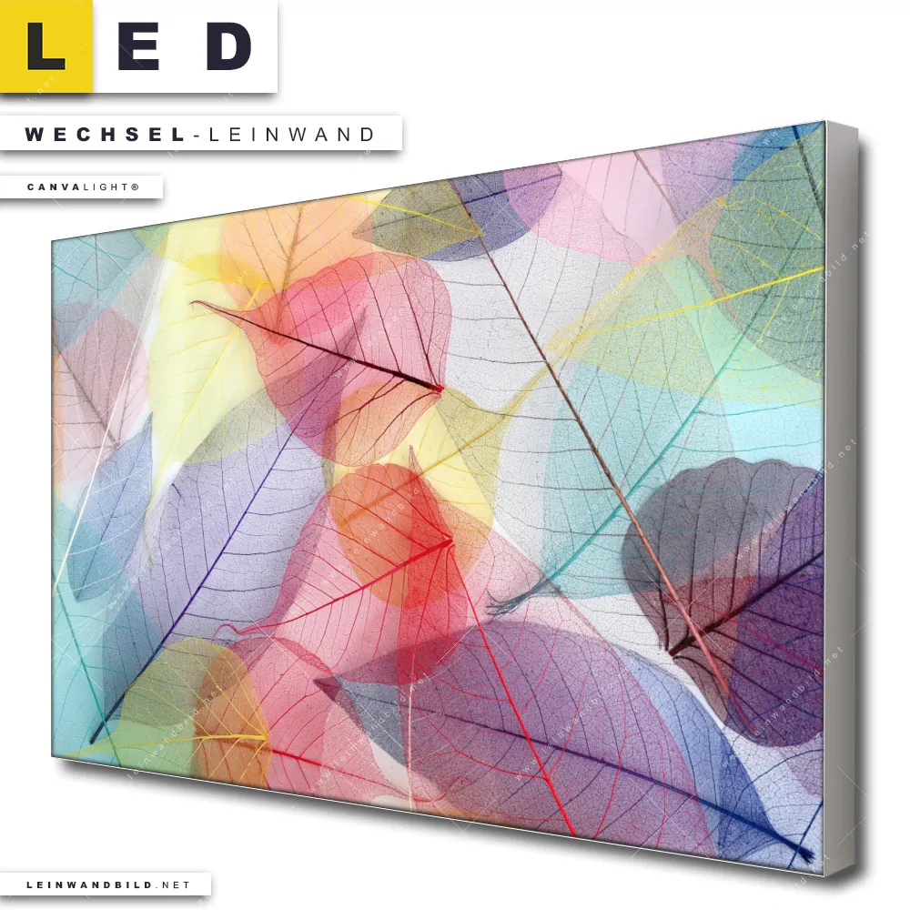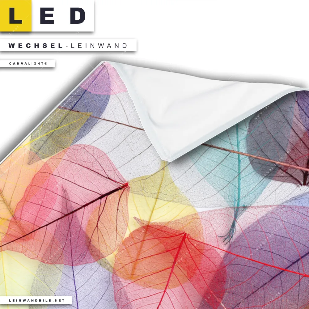 Du konfigurierst Deine individuelle LED Wechsel-Leinwand Canvalight® TEX | Bunte Blätter | Querformat und wir produzieren sie NEU für Dich. Unsere Muster - Texturen, Blumen - Botanik Austausch-Fotoleinwände für Canvalight® LED Bilder sind KEINE Lagerware. Du bist Dir unsicher, welches Motiv oder Format das richtige für dein individuelles LED Wechselmotiv auf Leinwand ist, dann helfen wir dir gerne weiter und beraten dich!
