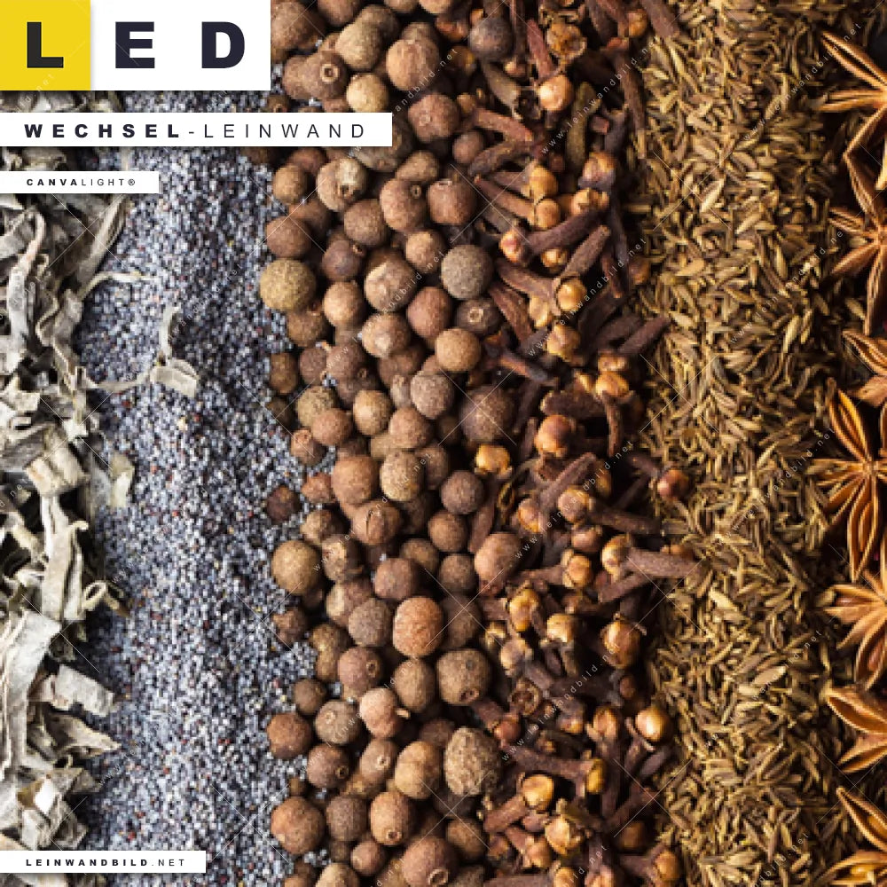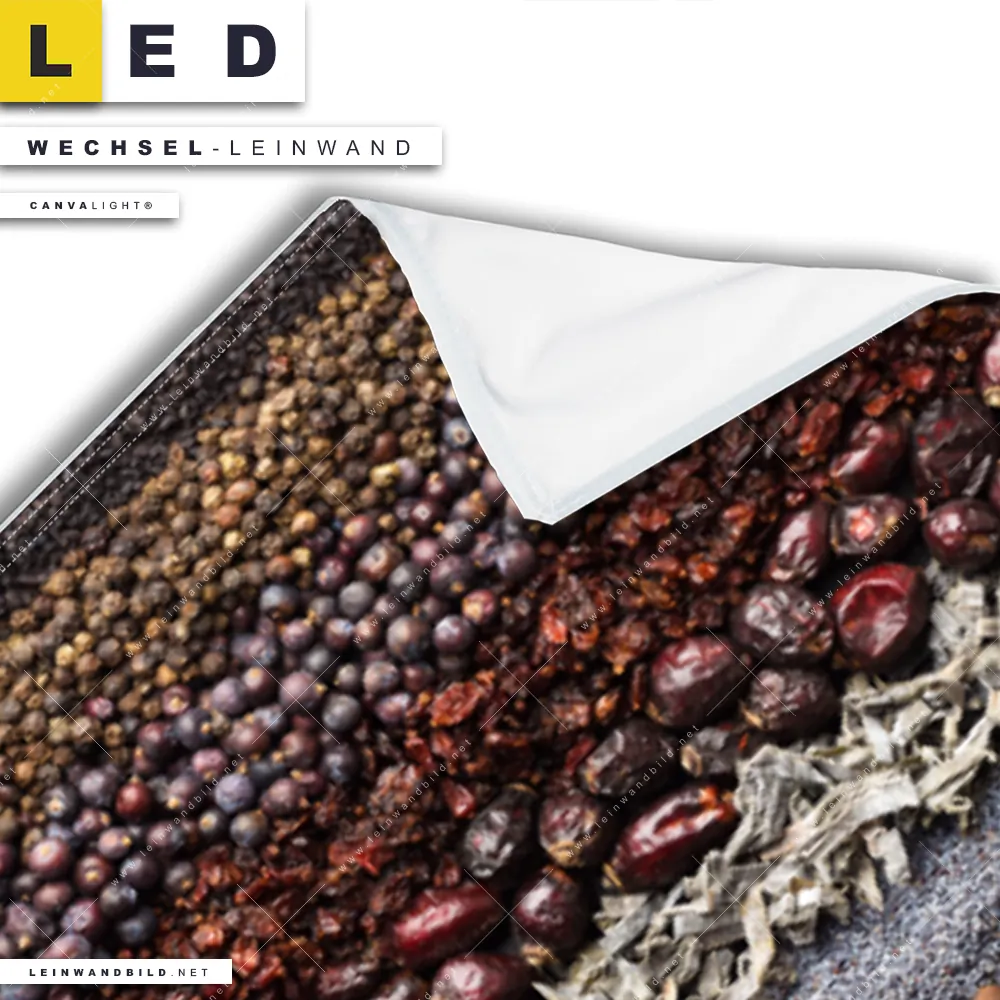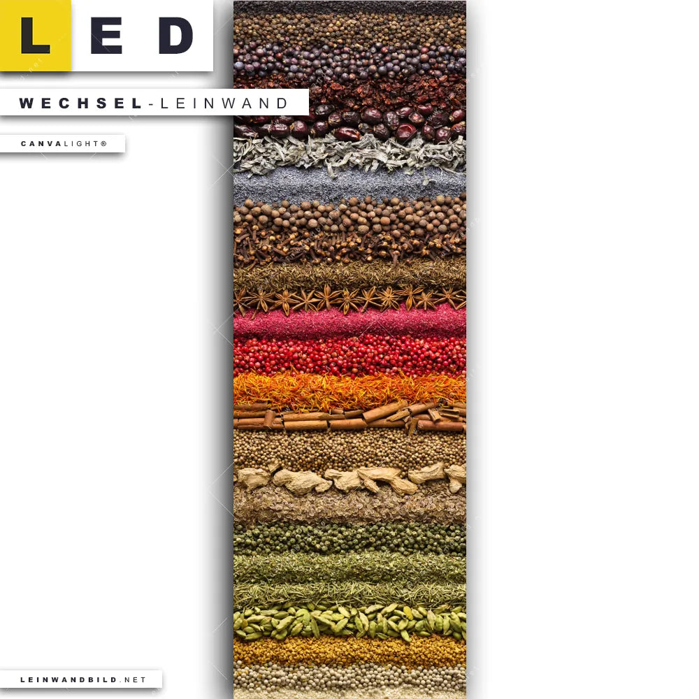 Du bist auf der Suche nach einer Essen - Trinken Wechsel-Leinwand für Dein LED-Leinwandbild im Schmalen Format? Begriffe wie Gewürze, Kräuter, kochen, Chili, Pfeffer, Paprika, Lebensmittel, Ernährung, Essen, Zimt, Vanille haben Dich auf der Suche nach Deiner Ersatz-Leinwand für dein LED Wandbild im Panorama-Hochformat mit wechselbarer Leinwand inspiriert? Farben wie Bunt dürfen auf Deinem neuen Wechselmotiv für Dein XXL Leinwand-LED-Bild nicht fehlen und Leinwände im Modern Art, Natürlich - Realistisch Stil für Leuchtbilder passen perfekt zu Deinem Einrichtungsstil?