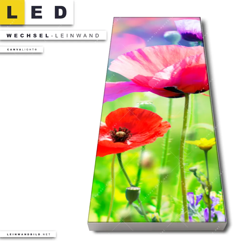 Du konfigurierst Deine individuelle LED Wechsel-Leinwand Canvalight® TEX | Bunte Mohnblumen | Schmal und wir produzieren sie NEU für Dich. Unsere Landschaften, Blumen - Botanik Austausch-Fotoleinwände für Canvalight® LED Bilder sind KEINE Lagerware. Du bist Dir unsicher, welches Motiv oder Format das richtige für dein individuelles LED Wechselmotiv auf Leinwand ist, dann helfen wir dir gerne weiter und beraten dich!