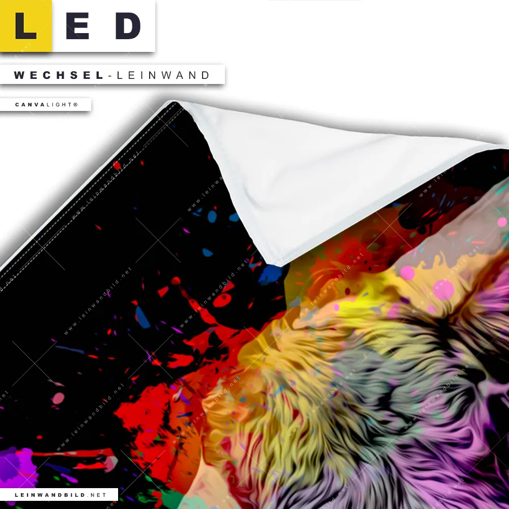 Dann sollte die Wechsel-Leinwand Canvalight® TEX | Bunter Stier Schwarz | Hochformat den Weg zu Dir finden. Die Austausch-Leinwand Stierkopf umgeben von Farbvielfalt - passend für unsere stufenlos dimmbaren, steckerfertigen Leinwandbilder im Leuchtrahmen mit Fernbedienung und optionaler Farbtemperatursteuerung - fügt sich als Eye-Catcher harmonisch in jedes Bar - Gastronomie, Wohnzimmer - Schlafzimmer, Flur - Eingangsbereich, Büro - Kanzlei Raumkonzept ein.