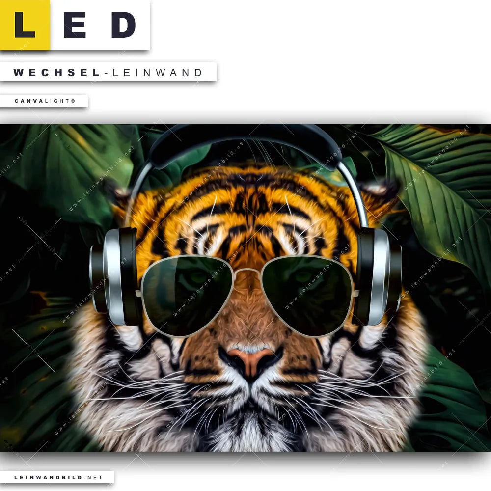 Auf der Suche nach Deinem neuen Wechselmotiv für LED Bilder mit austauschbarer Textil-Leinwand haben Dich Begriffe wie Raubkatze, Tiger, Afrika, Dschungel, Brille, Sonnenbrille, Blätter, Porträt inspiriert? Dann sollte die Wechsel-Leinwand Tiger liebt Musik für Canvalight® TEX LED Leuchtbilder den Weg zu Dir finden.