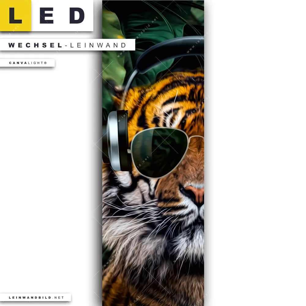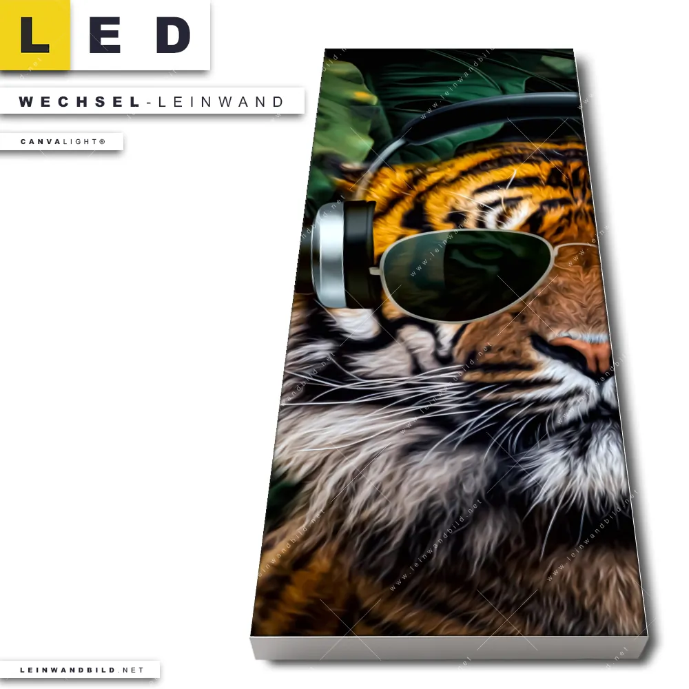 Dann sollte die Wechsel-Leinwand Canvalight® TEX | Cooler Tiger | Schmal den Weg zu Dir finden. Die Austausch-Leinwand Tiger liebt Musik - passend für unsere stufenlos dimmbaren, steckerfertigen Leinwandbilder im LED Leuchtrahmen mit Fernbedienung und optionaler Farbtemperatursteuerung - fügt sich als Eye-Catcher harmonisch in jedes Bar - Gastronomie, Wohnzimmer - Schlafzimmer, Büro - Kanzlei, Flur - Eingangsbereich Raumkonzept ein.