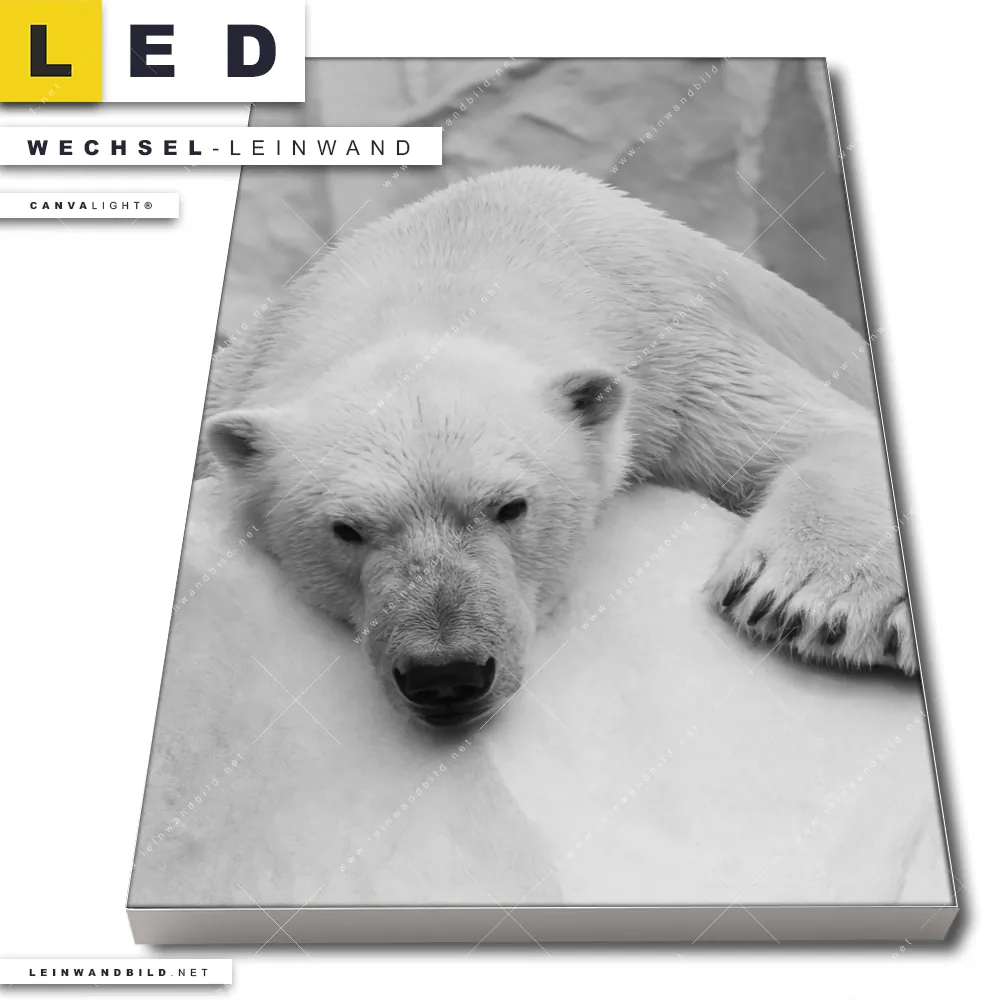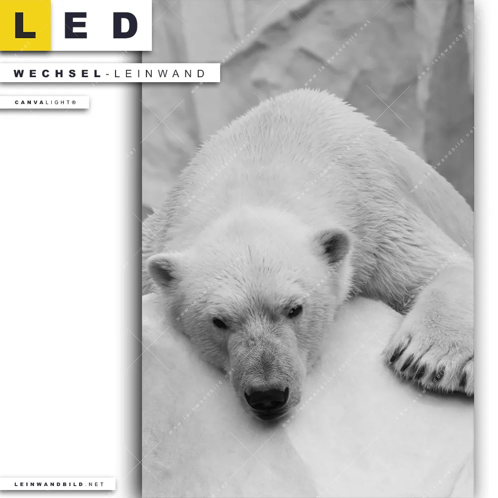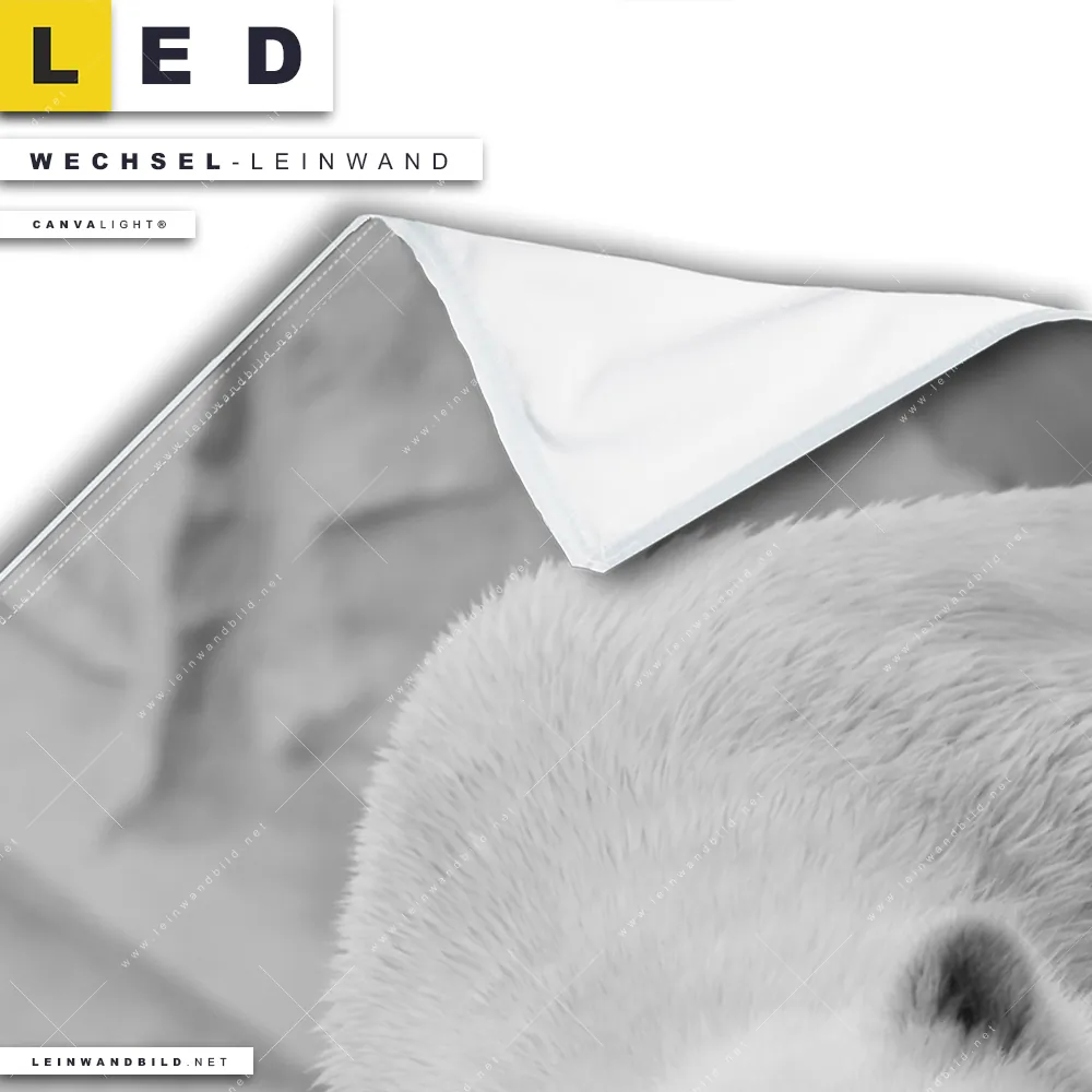 Du bist auf der Suche nach einer Tierwelt Wechsel-Leinwand für Dein LED-Leinwandbild im Hochformat? Begriffe wie Eisbär, Bär, weiss, kalt, Schnee, Winter haben Dich auf der Suche nach Deiner Ersatz-Leinwand für dein LED Wandbild mit wechselbarer Leinwand inspiriert? Farben wie Weiss dürfen auf Deinem neuen Wechselmotiv für Dein XXL Leinwand-LED-Bild nicht fehlen und Leinwände im Schwarz - Weiss, Natürlich - Realistisch Stil für Leuchtbilder passen perfekt zu Deinem Einrichtungsstil?