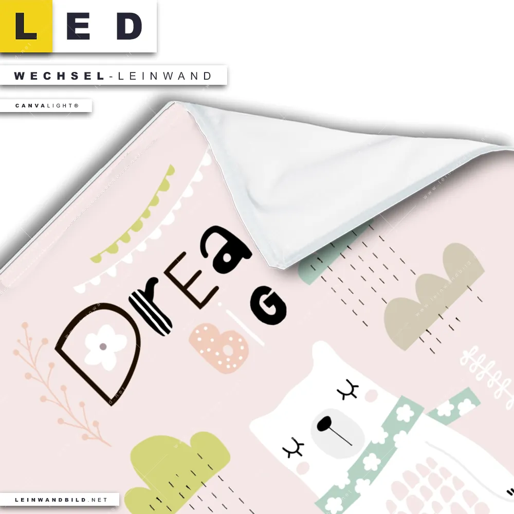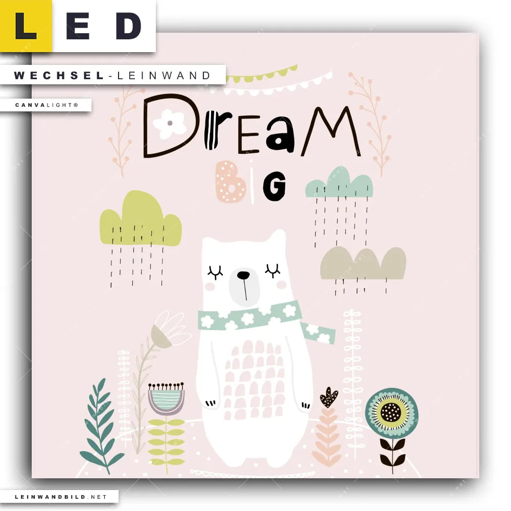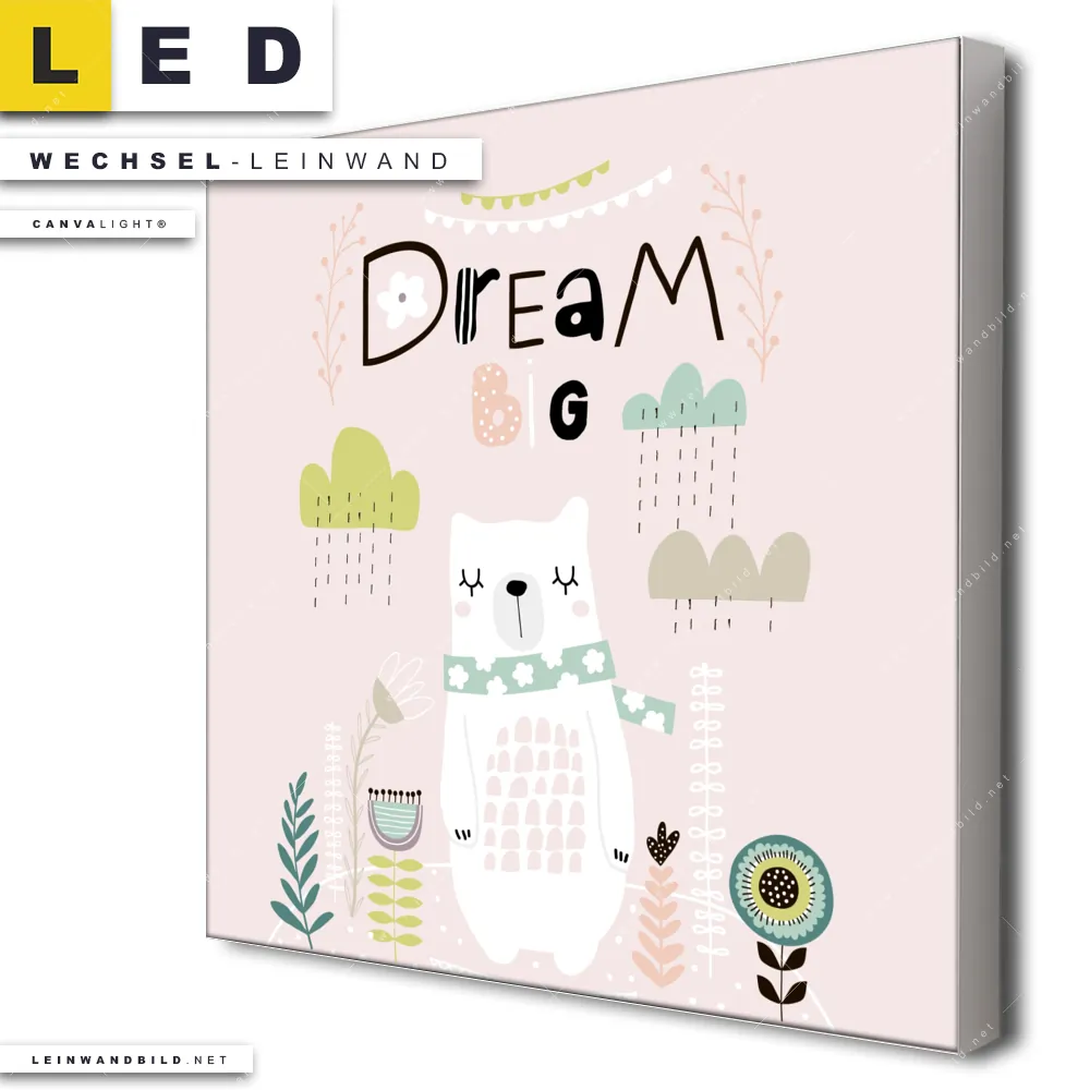 Dann sollte die Wechsel-Leinwand Canvalight® TEX | Dream Big Eisbär | Quadrat den Weg zu Dir finden. Die Austausch-Leinwand große Träume Eisbär - passend für unsere stufenlos dimmbaren, steckerfertigen Leinwandbilder im Leuchtrahmen mit Fernbedienung und optionaler Farbtemperatursteuerung - fügt sich als Eye-Catcher harmonisch in jedes Kinderzimmer, Arzt - Praxis, Friseur - Beauty Raumkonzept ein.