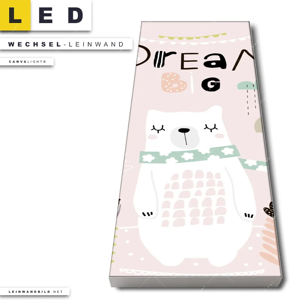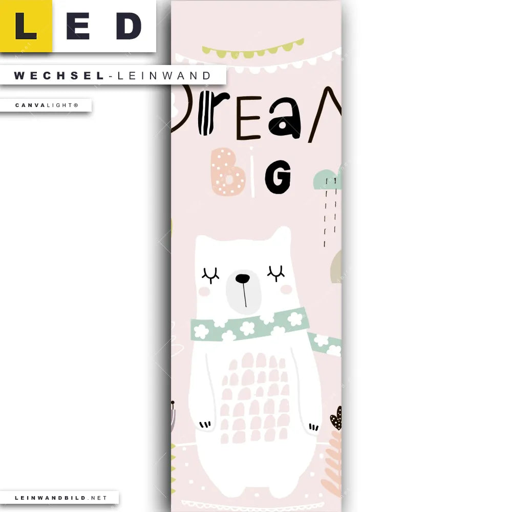 Dann sollte die Wechsel-Leinwand Canvalight® TEX | Dream Big Eisbär | Schmal den Weg zu Dir finden. Die Austausch-Leinwand Eisbär Kindermotiv - passend für unsere stufenlos dimmbaren, steckerfertigen Leinwandbilder im LED Leuchtrahmen mit Fernbedienung und optionaler Farbtemperatursteuerung - fügt sich als Eye-Catcher harmonisch in jedes Kinderzimmer, Arzt - Praxis, Friseur - Beauty Raumkonzept ein.
