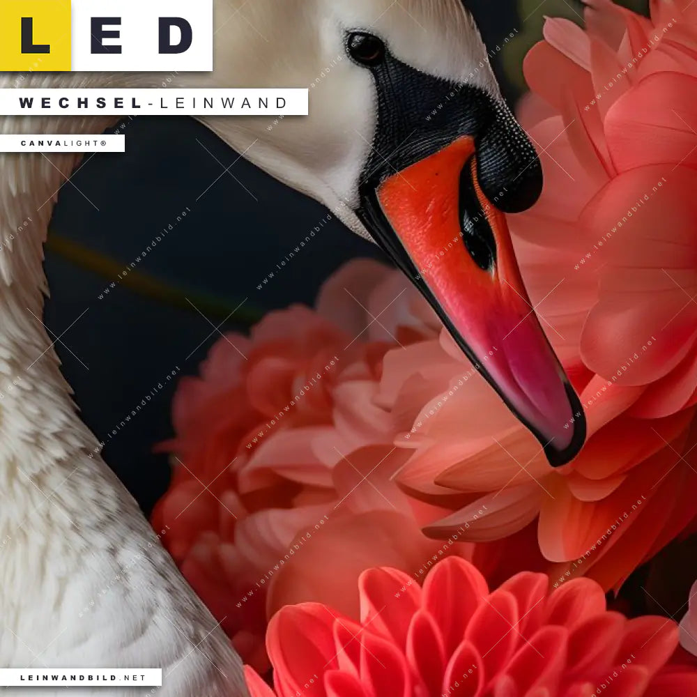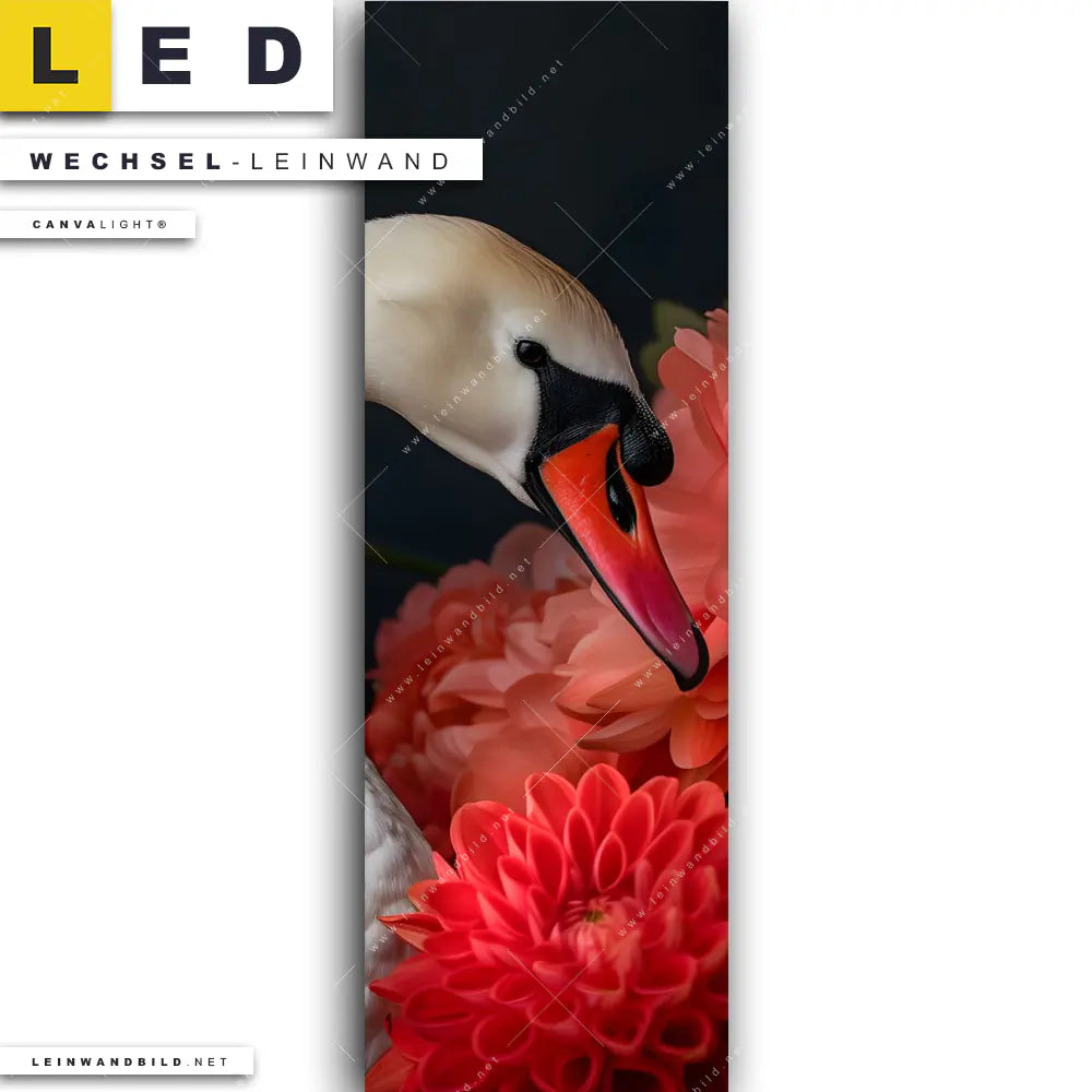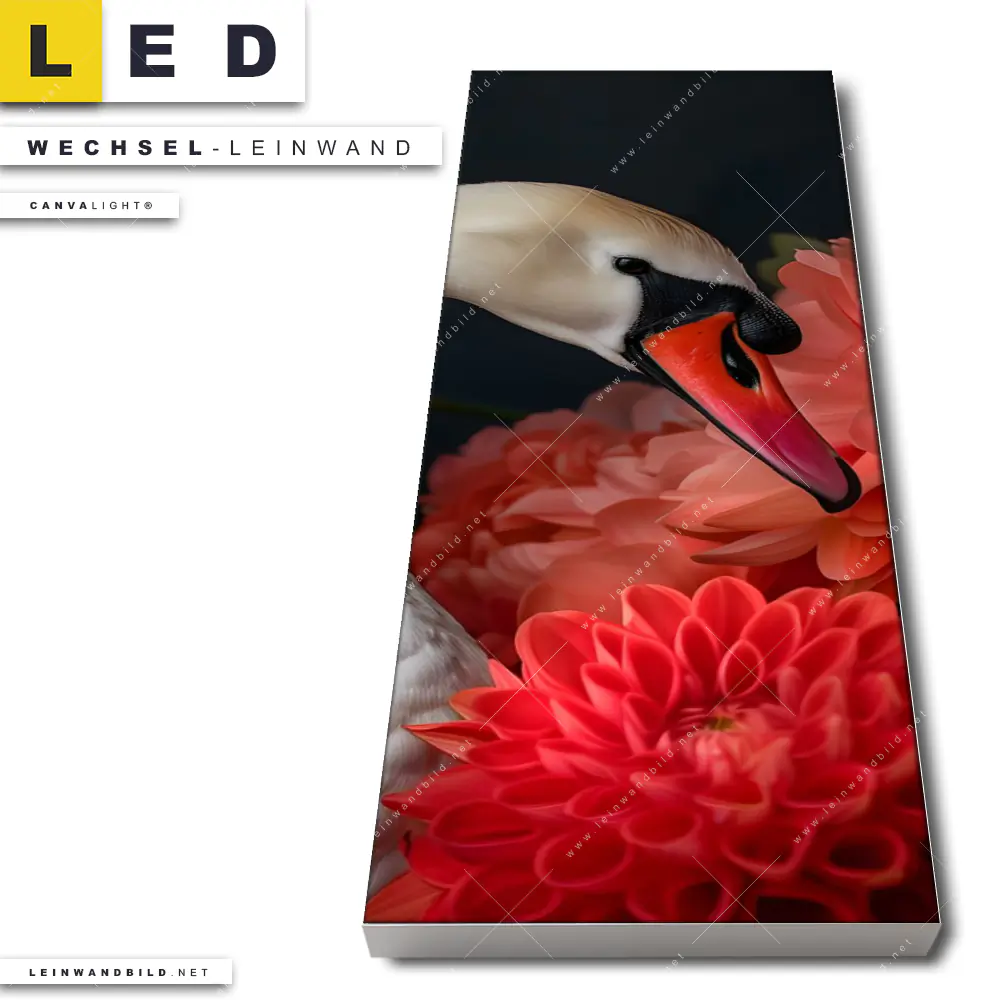 Du bist auf der Suche nach einer Tierwelt, Blumen - Botanik Wechsel-Leinwand für Dein LED-Leinwandbild im Schmalen Format? Begriffe wie Vogel, Schwan, Liebe, Blumen, Blüten, Dahlien, Romantik haben Dich auf der Suche nach Deiner Ersatz-Leinwand für dein LED Wandbild im Panorama-Hochformat mit wechselbarer Leinwand inspiriert? Farben wie Weiss, Rot, Schwarz dürfen auf Deinem neuen Wechselmotiv für Dein XXL Leinwand-LED-Bild nicht fehlen und Leinwände im Floral, Natürlich - Realistisch Stil für Leuchtbilder passen perfekt zu Deinem Einrichtungsstil?