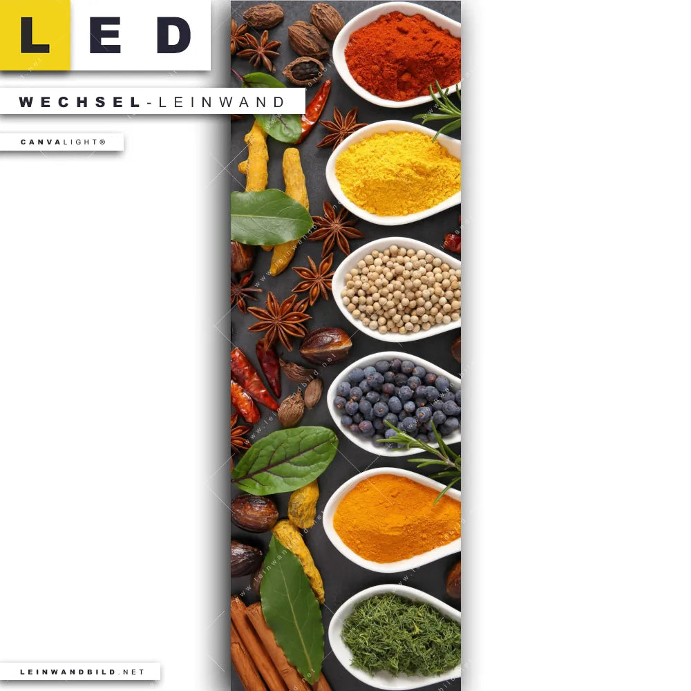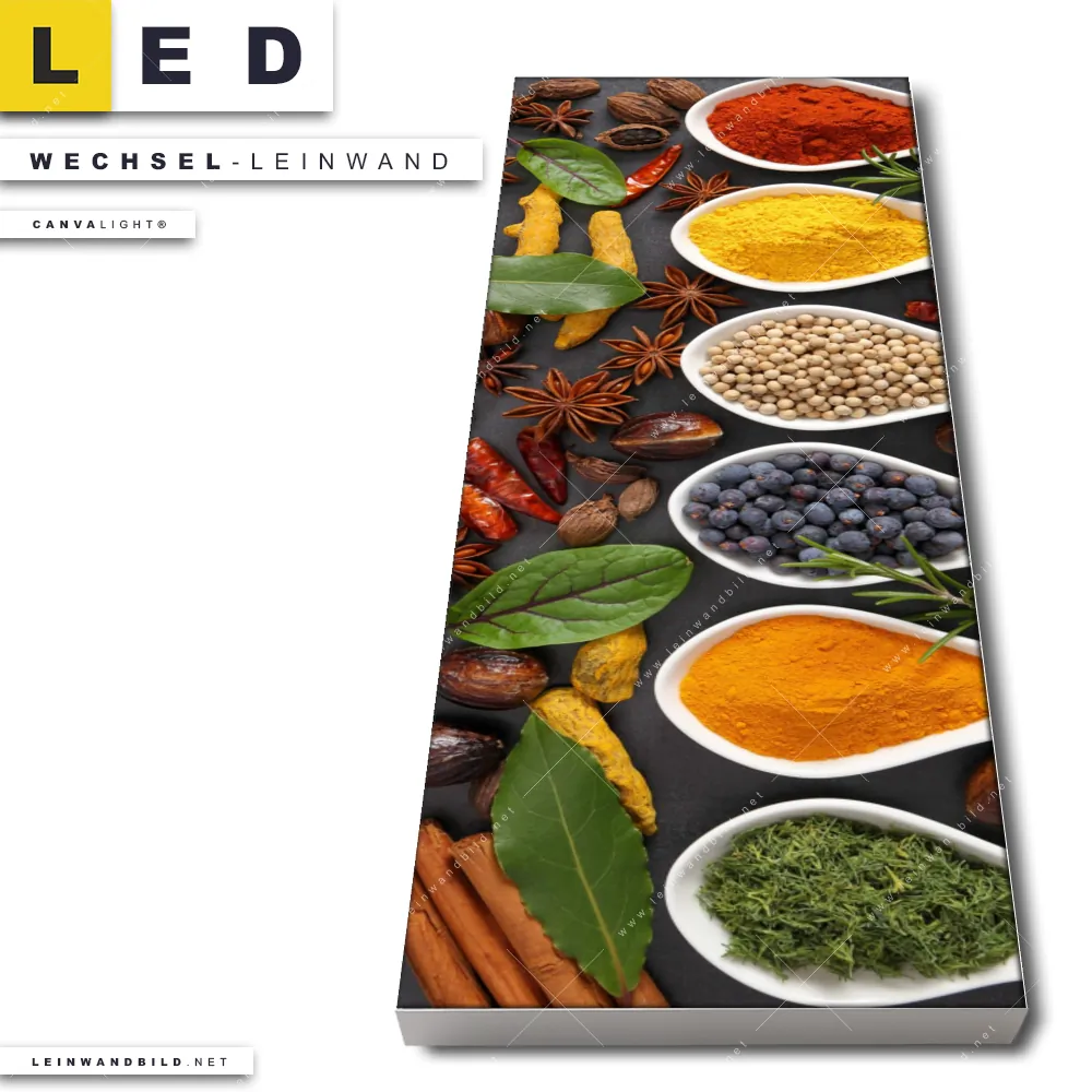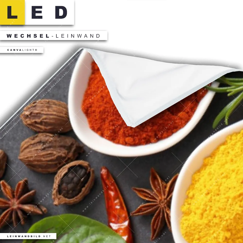 Dann sollte die Wechsel-Leinwand Canvalight® TEX | Exotische Geschmackswelten | Schmal den Weg zu Dir finden. Die Austausch-Leinwand Farbenfrohe Gewürze & Kräuter - passend für unsere stufenlos dimmbaren, steckerfertigen Leinwandbilder im LED Leuchtrahmen mit Fernbedienung und optionaler Farbtemperatursteuerung - fügt sich als Eye-Catcher harmonisch in jedes Bar - Gastronomie, Küche - Esszimmer Raumkonzept ein.
