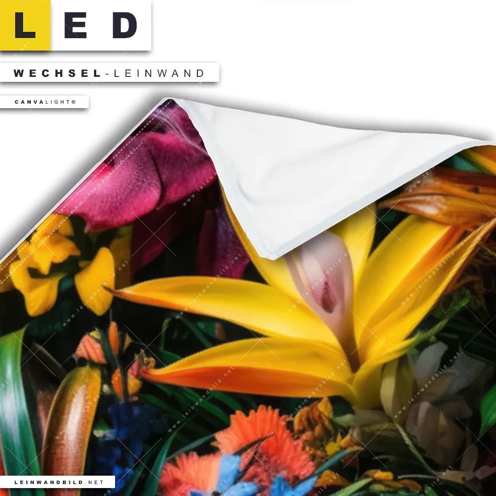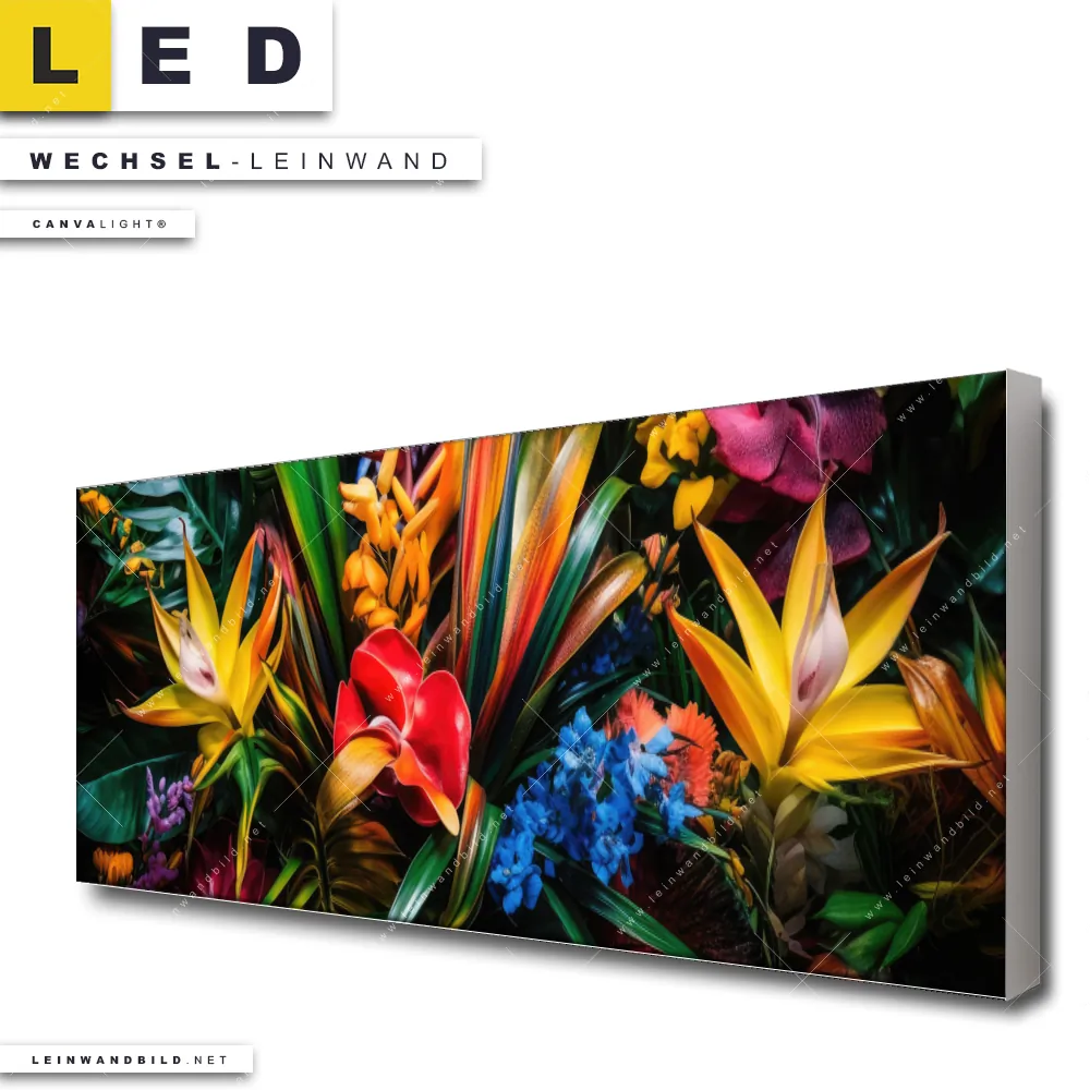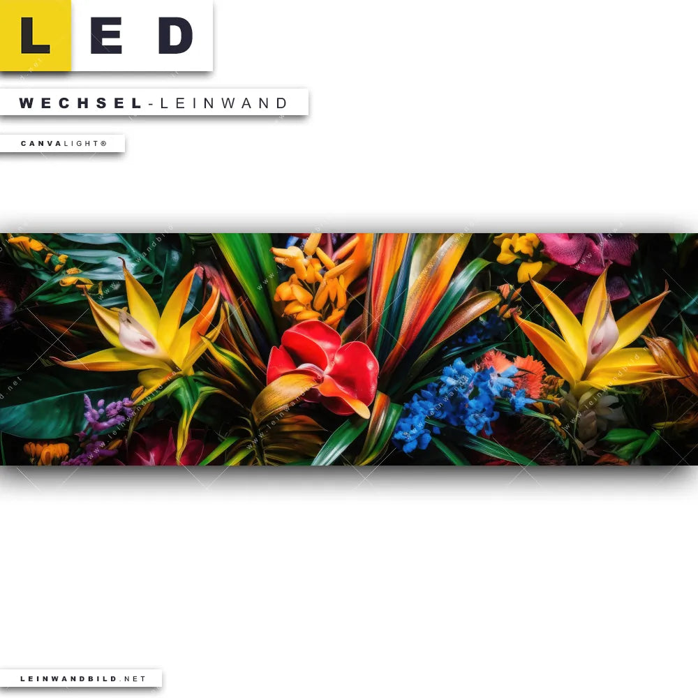 Du bist auf der Suche nach einer Blumen - Botanik Wechsel-Leinwand für Dein LED-Leinwandbild im Panorama-Format? Begriffe wie Blätter, Pflanze, Natur, Laub, Dschungel, Blüten, Blumen haben Dich auf der Suche nach Deiner Ersatz-Leinwand für dein extra breites LED Wandbild mit wechselbarer Leinwand inspiriert? Farben wie Grün, Rot, Gelb , Blau dürfen auf Deinem neuen Wechselmotiv für Dein XXL Leinwand-LED-Bild nicht fehlen und Leinwände im Floral, Modern Art Stil für Leuchtbilder passen perfekt zu Deinem Einrichtungsstil?