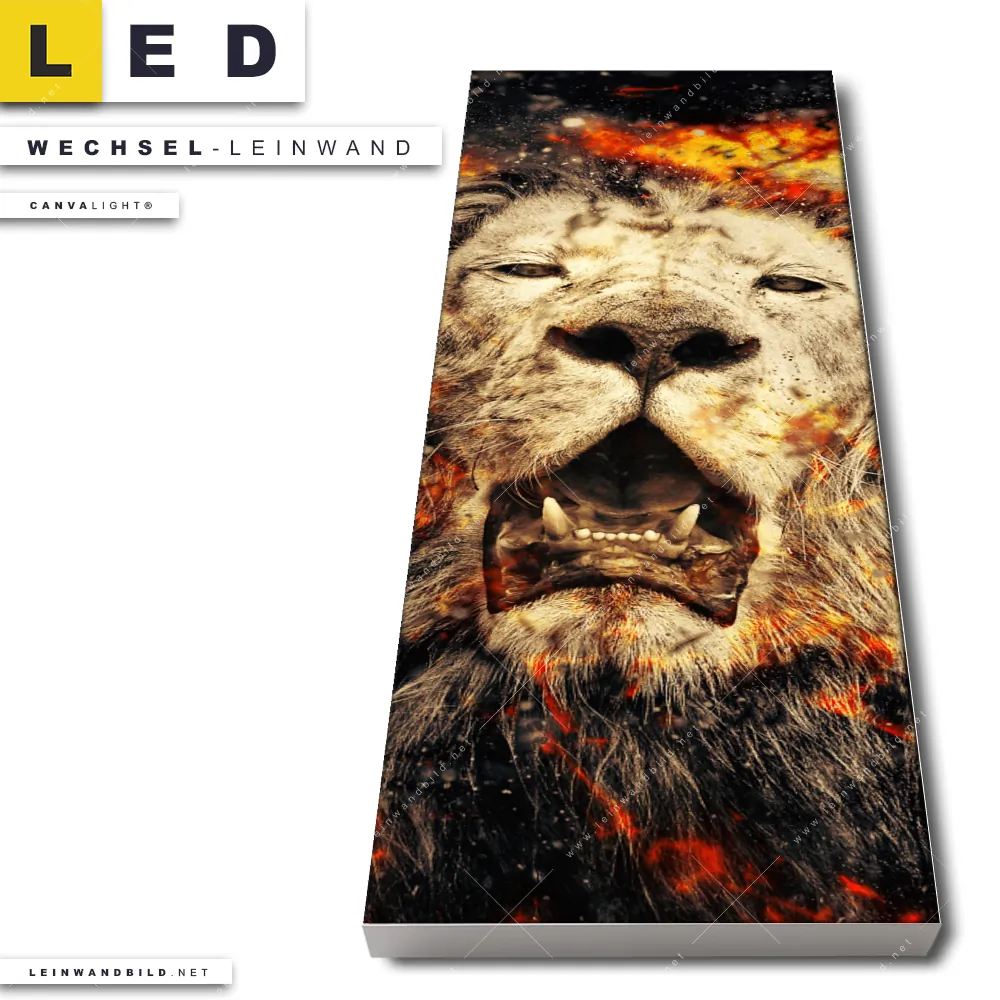Du bist auf der Suche nach einer Tierwelt Wechsel-Leinwand für Dein LED-Leinwandbild im Schmalen Format? Begriffe wie Raubkatze, Löwe, Afrika, Dschungel, wild, Safari, Lion, Feuer, Flammen, Porträt haben Dich auf der Suche nach Deiner Ersatz-Leinwand für dein LED Wandbild im Panorama-Hochformat mit wechselbarer Leinwand inspiriert? Farben wie Schwarz, Beige, Rot, Orange dürfen auf Deinem neuen Wechselmotiv für Dein XXL Leinwand-LED-Bild nicht fehlen und Leinwände im Mixed Media, Modern Art Stil für Leuchtbilder passen perfekt zu Deinem Einrichtungsstil?