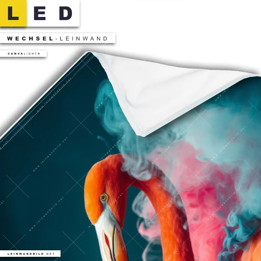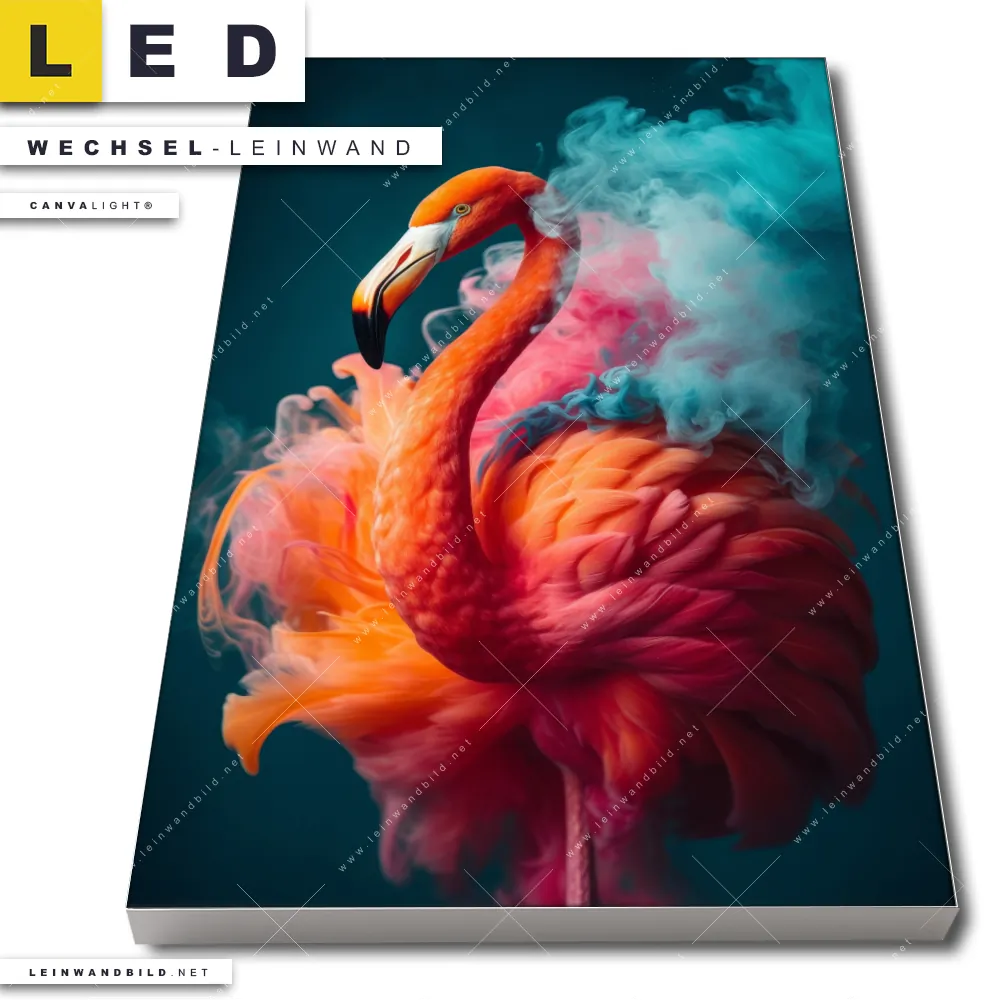 LED Wechsel-Leinwand Canvalight® TEX | Flamingo in bunter Rauchwolke | Hochformat