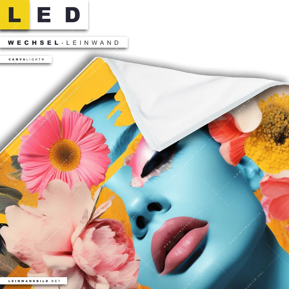 Du bist auf der Suche nach einer Porträts - Menschen, Blumen - Botanik Wechsel-Leinwand für Dein LED-Leinwandbild im Quadratischen Format? Begriffe wie Menschen & Blumen, Frau, Porträt, Gesicht, Blumen, Blüten, Frisur, Haare haben Dich auf der Suche nach Deiner Ersatz-Leinwand für dein LED Wandbild mit wechselbarer Leinwand inspiriert? Farben wie Rot, Blau, Orange, Hellblau, Weiss dürfen auf Deinem neuen Wechselmotiv für Dein XXL Leinwand-LED-Bild nicht fehlen und Leinwände im Modern Art, Floral, Pop Art, Mixed Media Stil für Leuchtbilder passen perfekt zu Deinem Einrichtungsstil?