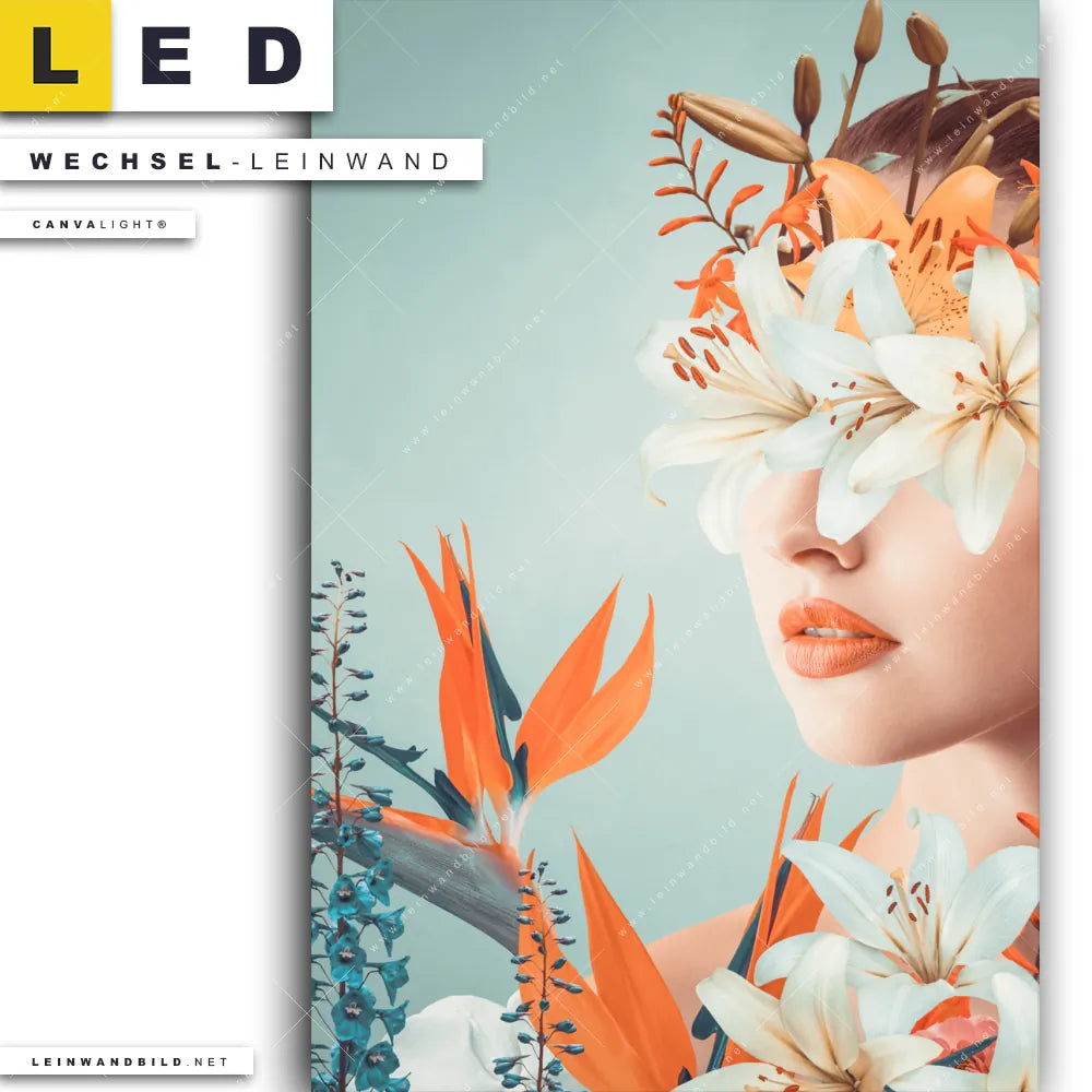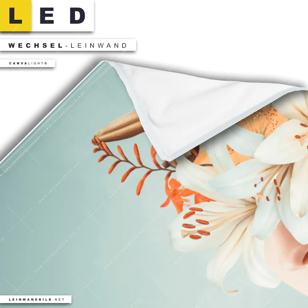 Du bist auf der Suche nach einer Porträts - Menschen, Blumen - Botanik Wechsel-Leinwand für Dein LED-Leinwandbild im Hochformat? Begriffe wie Menschen & Blumen, Frau, Porträt, Gesicht, Blumen, Blüten, Frisur, Haare haben Dich auf der Suche nach Deiner Ersatz-Leinwand für dein LED Wandbild mit wechselbarer Leinwand inspiriert? Farben wie Orange, Hellblau, Weiss, Hellgrün dürfen auf Deinem neuen Wechselmotiv für Dein XXL Leinwand-LED-Bild nicht fehlen und Leinwände im Modern Art, Floral Stil für Leuchtbilder passen perfekt zu Deinem Einrichtungsstil?