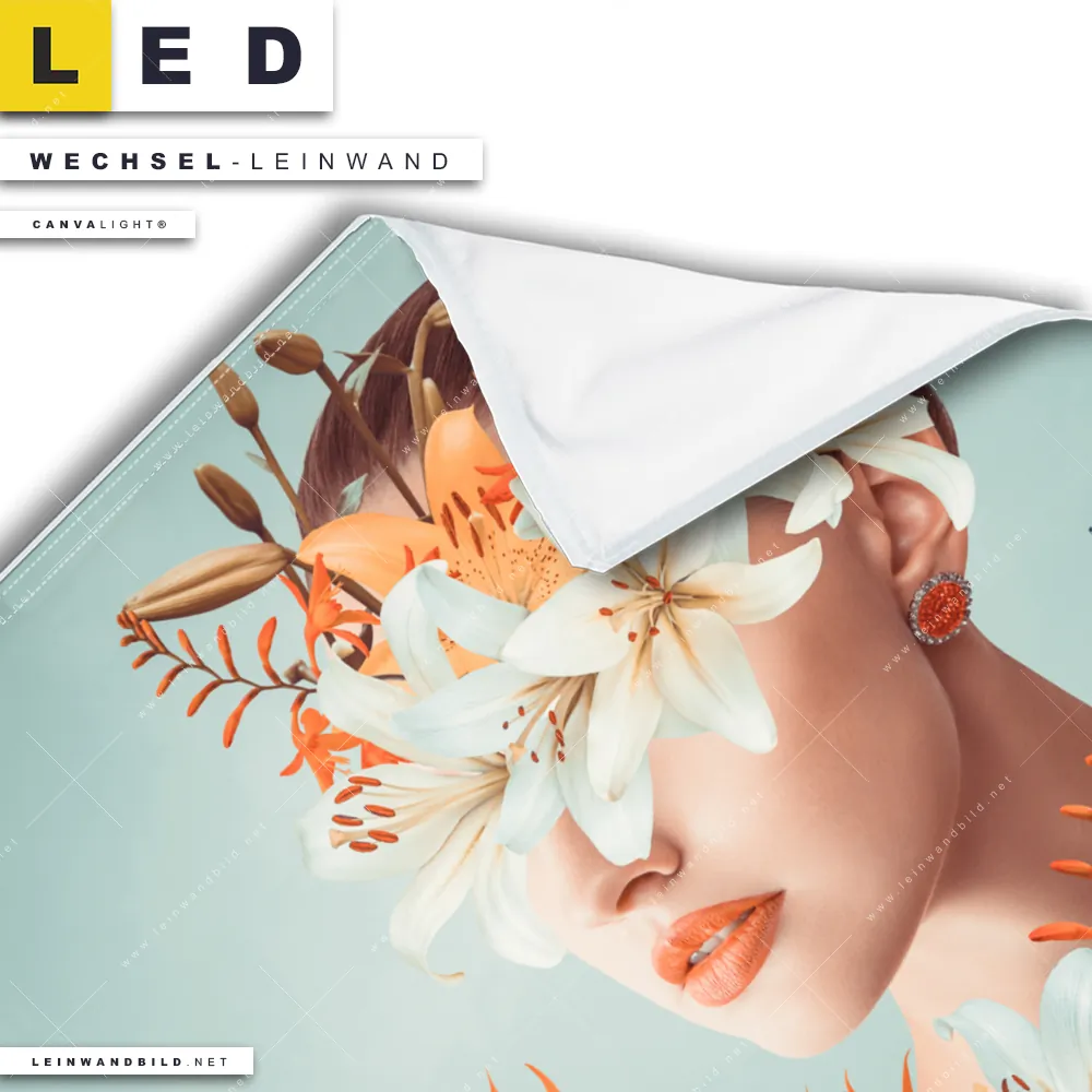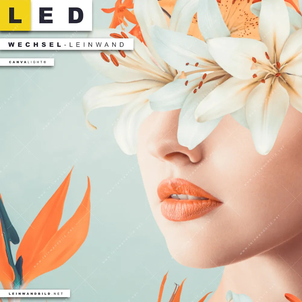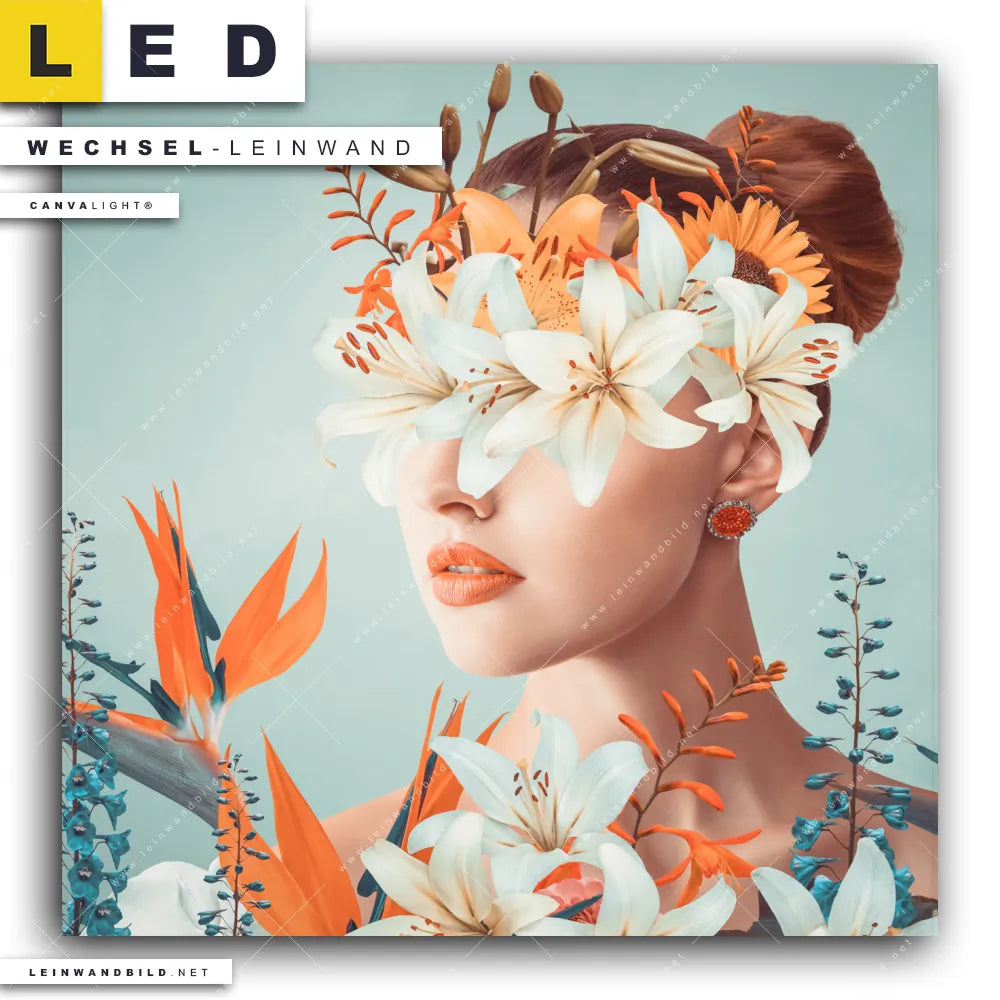Du bist auf der Suche nach einer Porträts - Menschen, Blumen - Botanik Wechsel-Leinwand für Dein LED-Leinwandbild im Quadratischen Format? Begriffe wie Menschen & Blumen, Frau, Porträt, Gesicht, Blumen, Blüten, Frisur, Haare haben Dich auf der Suche nach Deiner Ersatz-Leinwand für dein LED Wandbild mit wechselbarer Leinwand inspiriert? Farben wie Orange, Hellblau, Weiss, Hellgrün dürfen auf Deinem neuen Wechselmotiv für Dein XXL Leinwand-LED-Bild nicht fehlen und Leinwände im Modern Art, Floral Stil für Leuchtbilder passen perfekt zu Deinem Einrichtungsstil?