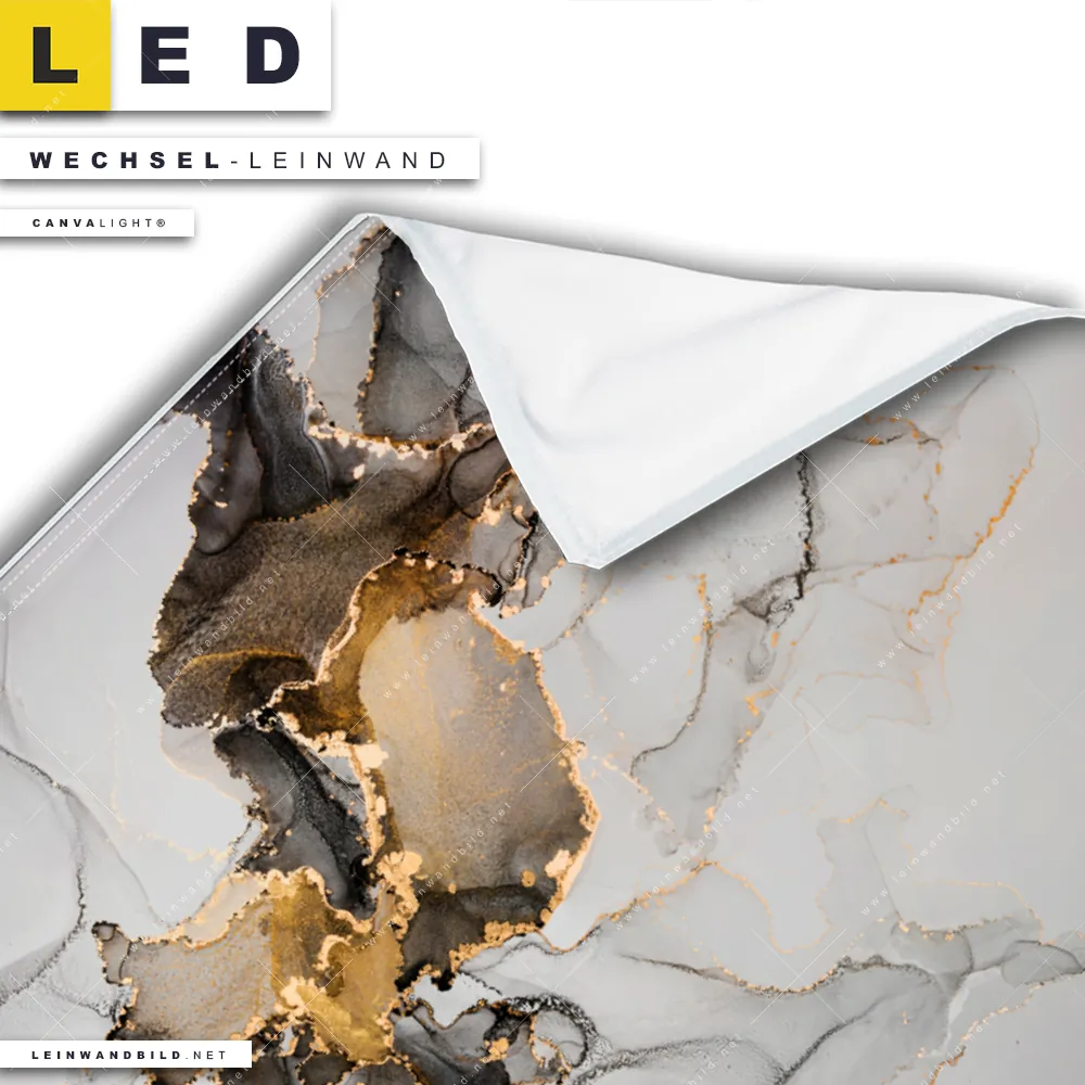 Du bist auf der Suche nach einer Muster - Texturen Wechsel-Leinwand für Dein LED-Leinwandbild im Querformat? Begriffe wie Flüssigkeit, Acryl, flüssig, Farbe, Marmorierung, Tinte, Alkohol, Goldader, Fluid Art haben Dich auf der Suche nach Deiner Ersatz-Leinwand für dein breites LED Wandbild mit wechselbarer Leinwand inspiriert? Farben wie Gold, Weiss, Schwarz dürfen auf Deinem neuen Wechselmotiv für Dein XXL Leinwand-LED-Bild nicht fehlen und Leinwände im Abstrakt, Modern Art Stil für Leuchtbilder passen perfekt zu Deinem Einrichtungsstil?