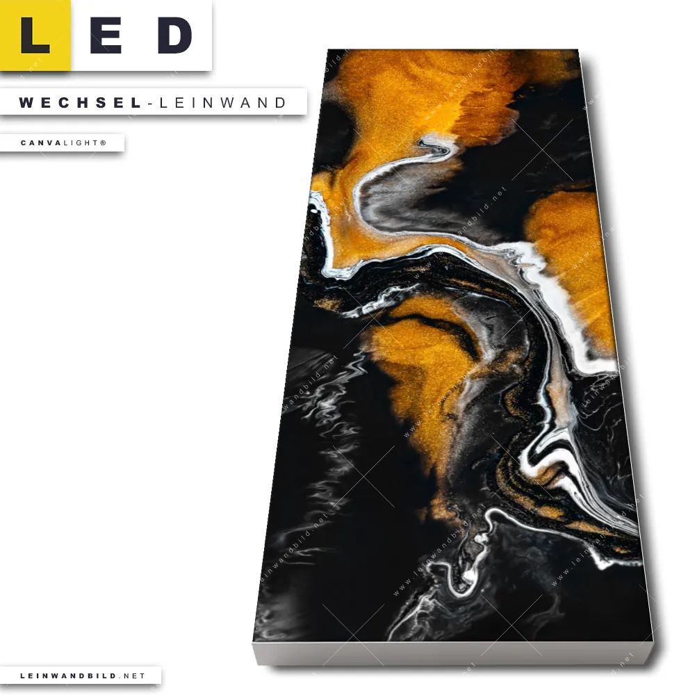 Du bist auf der Suche nach einer Muster - Texturen Wechsel-Leinwand für Dein LED-Leinwandbild im Schmalen Format? Begriffe wie Flüssigkeit, Acryl, flüssig, Farbe, Marmorierung, Tinte, Alkohol, Fluid Art haben Dich auf der Suche nach Deiner Ersatz-Leinwand für dein LED Wandbild im Panorama-Hochformat mit wechselbarer Leinwand inspiriert? Farben wie Schwarz, Orange, Gold dürfen auf Deinem neuen Wechselmotiv für Dein XXL Leinwand-LED-Bild nicht fehlen und Leinwände im Abstrakt, Modern Art Stil für Leuchtbilder passen perfekt zu Deinem Einrichtungsstil?