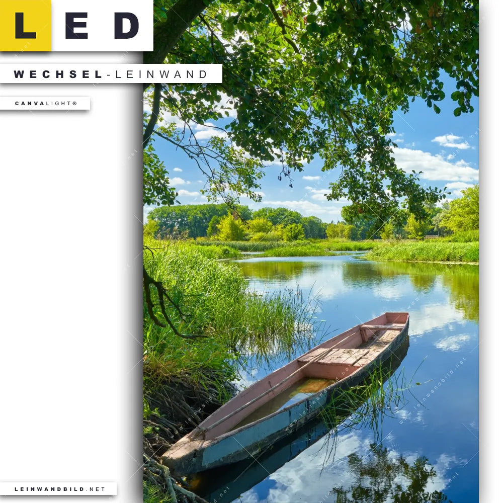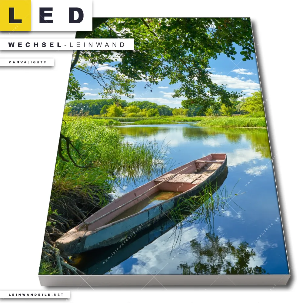 Du bist auf der Suche nach einer Landschaften Wechsel-Leinwand für Dein LED-Leinwandbild im Hochformat? Begriffe wie Urlaub, Reisen, Wasser, Wasserspiegelung, Boot, Bäume, Fluss, See, Wald haben Dich auf der Suche nach Deiner Ersatz-Leinwand für dein LED Wandbild mit wechselbarer Leinwand inspiriert? Farben wie Blau, Hellgrün, Hellblau, Grün dürfen auf Deinem neuen Wechselmotiv für Dein XXL Leinwand-LED-Bild nicht fehlen und Leinwände im Natürlich - Realistisch Stil für Leuchtbilder passen perfekt zu Deinem Einrichtungsstil?
